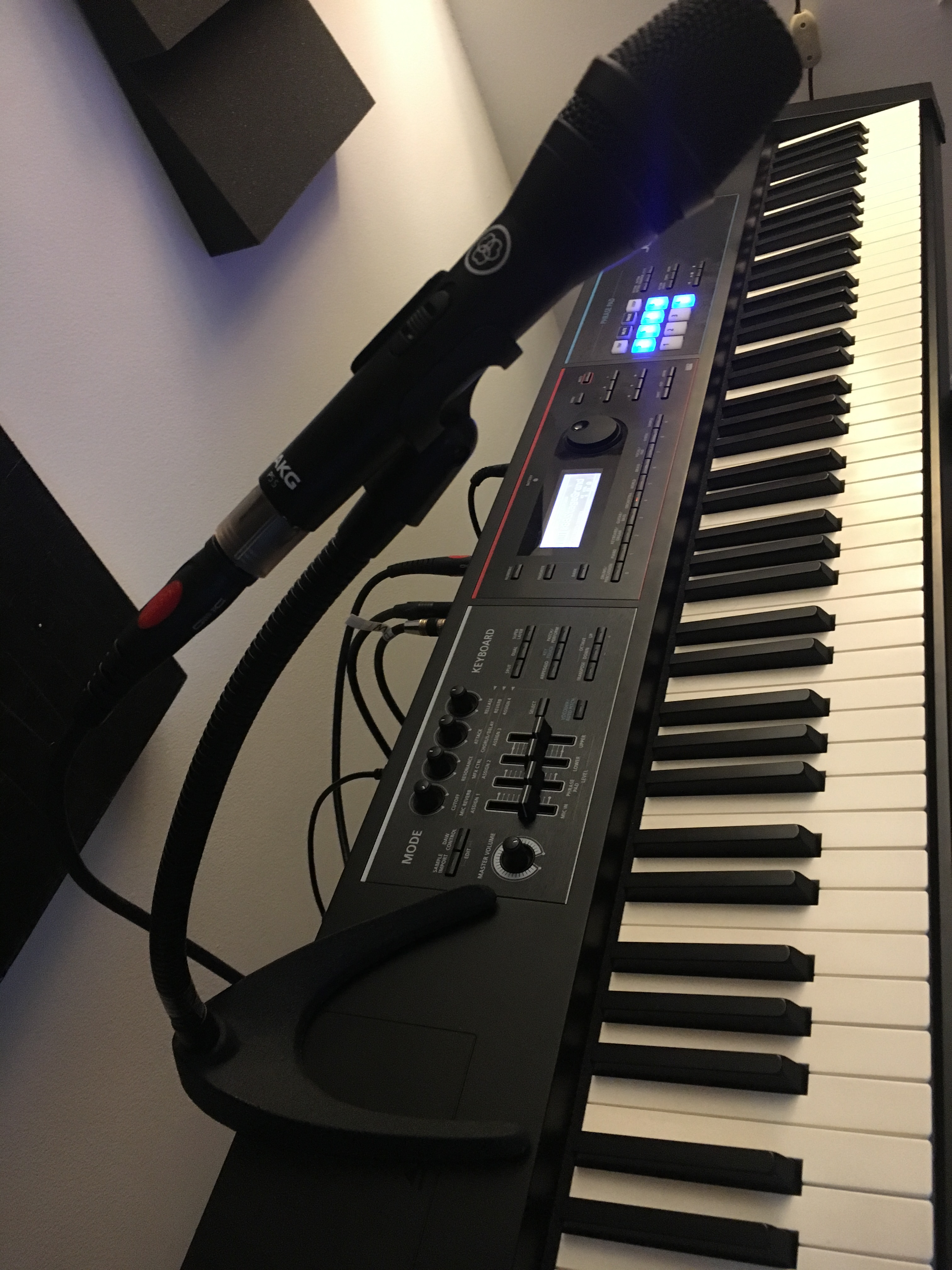 This is Andrea, a AKG P5S. It's purpose is to supplement the audio function of my other friend: the Roland synthesizer Juno DS.