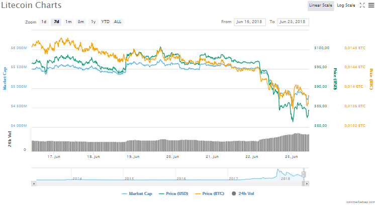 In the past few days, the highest price traded by the LTC was $ 100, close to $ 7 billion. At the time of writing, Litecoin is trading at 84.18 dollars, down by 8.2%. Crypto money reached its lowest level after November 2017 at this price. Litecoin now ranks 6th with a market value of $ 4.8 billion.