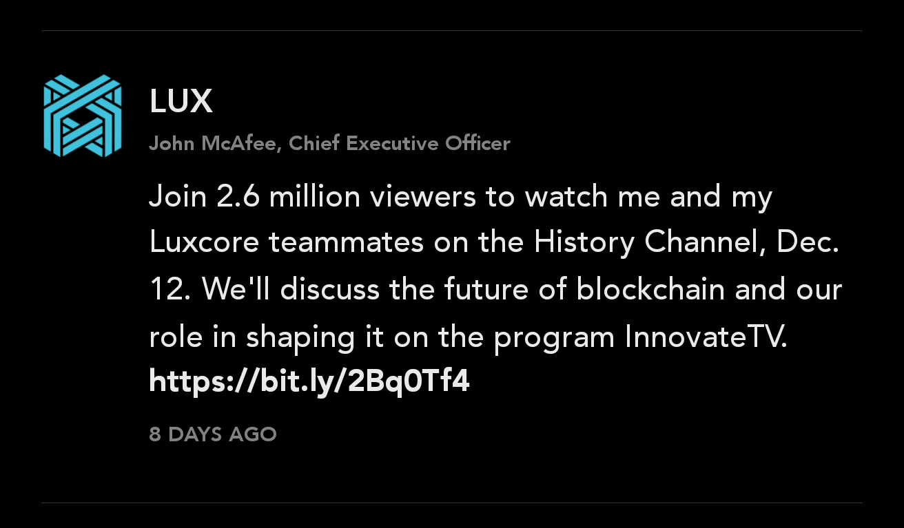 This is a reminder that Luxcore's much-anticipated appearance on InnovateTV is airing next week on the History Channel.