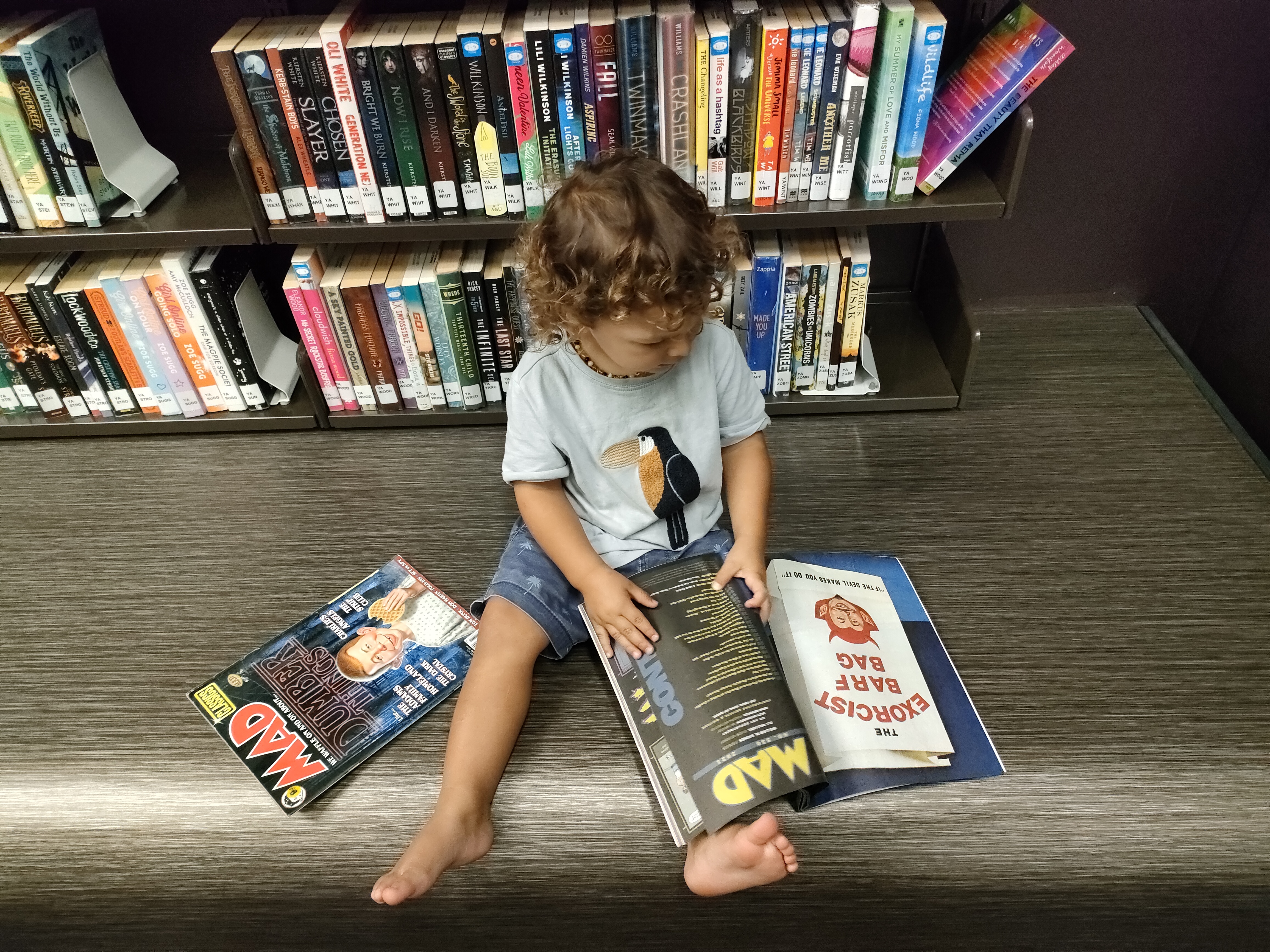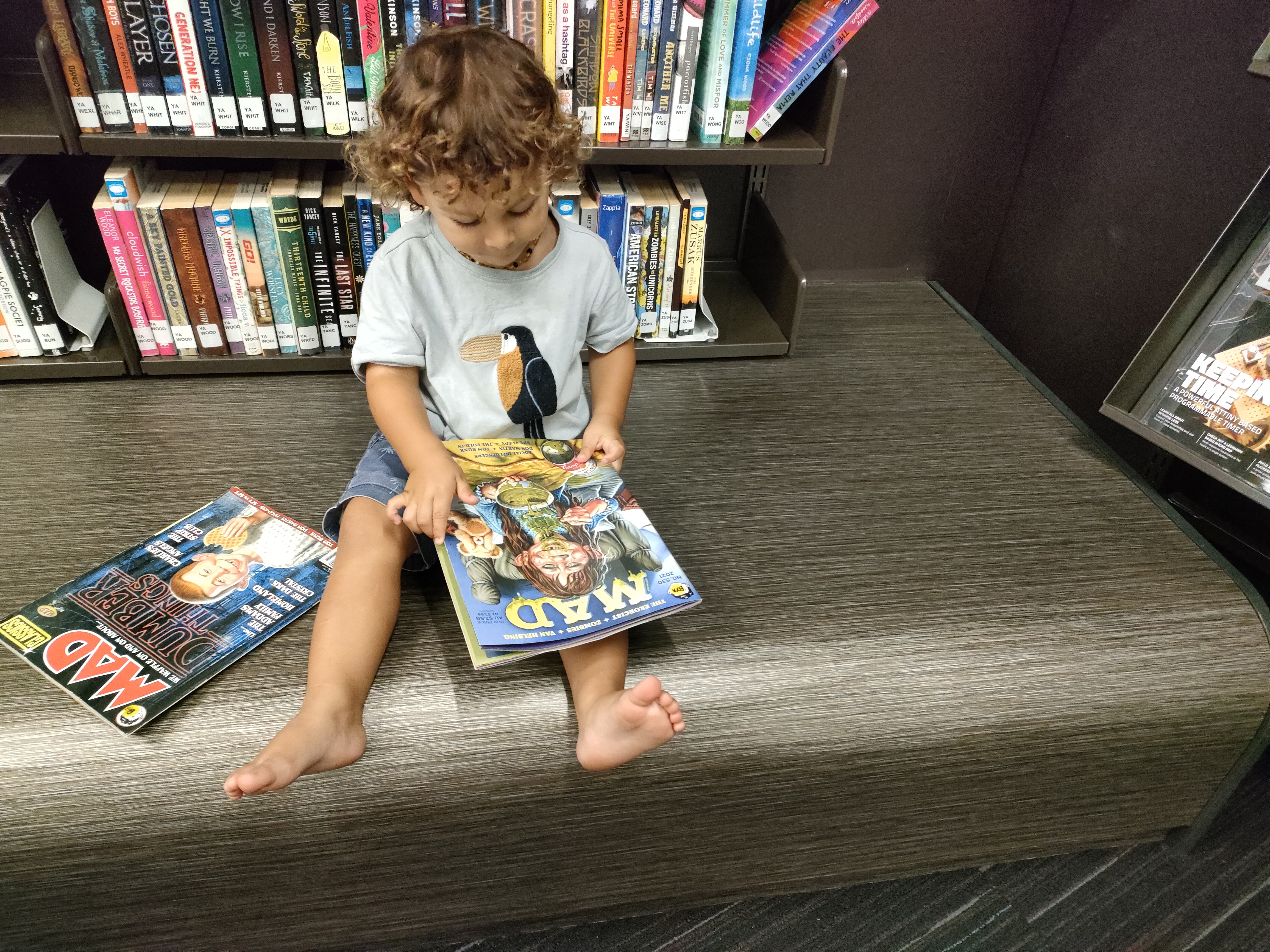 My 2 year old son Attila reading MAD MAGAZINE in the library today. We were starting to go crazy sitting around the house on this cold rainy day so we headed to the local library. Atti got bored after reading a couple of books in the kids section and went around to explore the other parts of the library. He ended up in the comics section and grab a couple of Magazines off the shelf and sat down and started flicking through the pages by him self