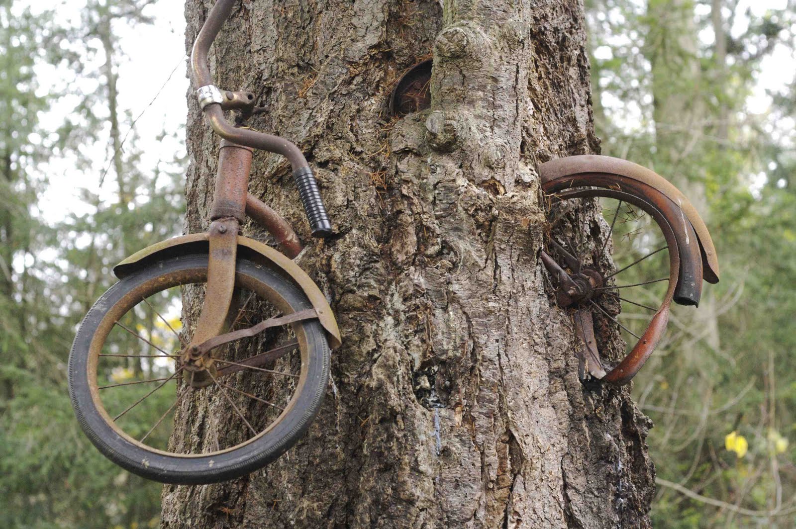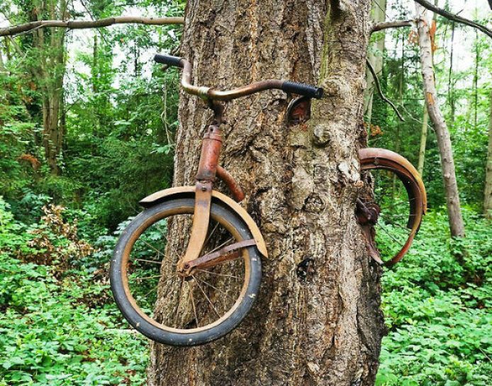The colors on this bike are already very faded, and become brownish red. And even, the iron was rusted, and the radius of the two wheels was still complete. However, the rear wheel only halfway. The rim was already dented and no brakes on the handlebars. And at first glance, nothing strange with the shape of the bike. However, you would be stunned if you look at the bike's parking lot. And not in the backyard, but in the center of the tree trunk and the alias in the tree-eating, in Vashton Island, Washington.