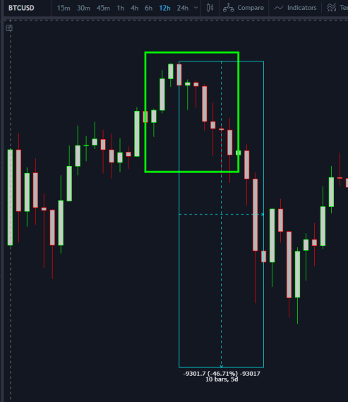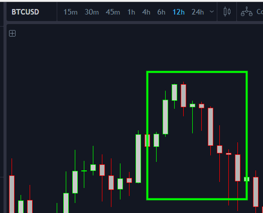 With crypto as volatile as it is, sometimes the candles are not always a solid color going all the way up a trend, and you may see a lot of smaller candles or candles of the opposite color popping up all throughout the trend, so just using candle size and position isn't always a perfect indication of a possible reversal.