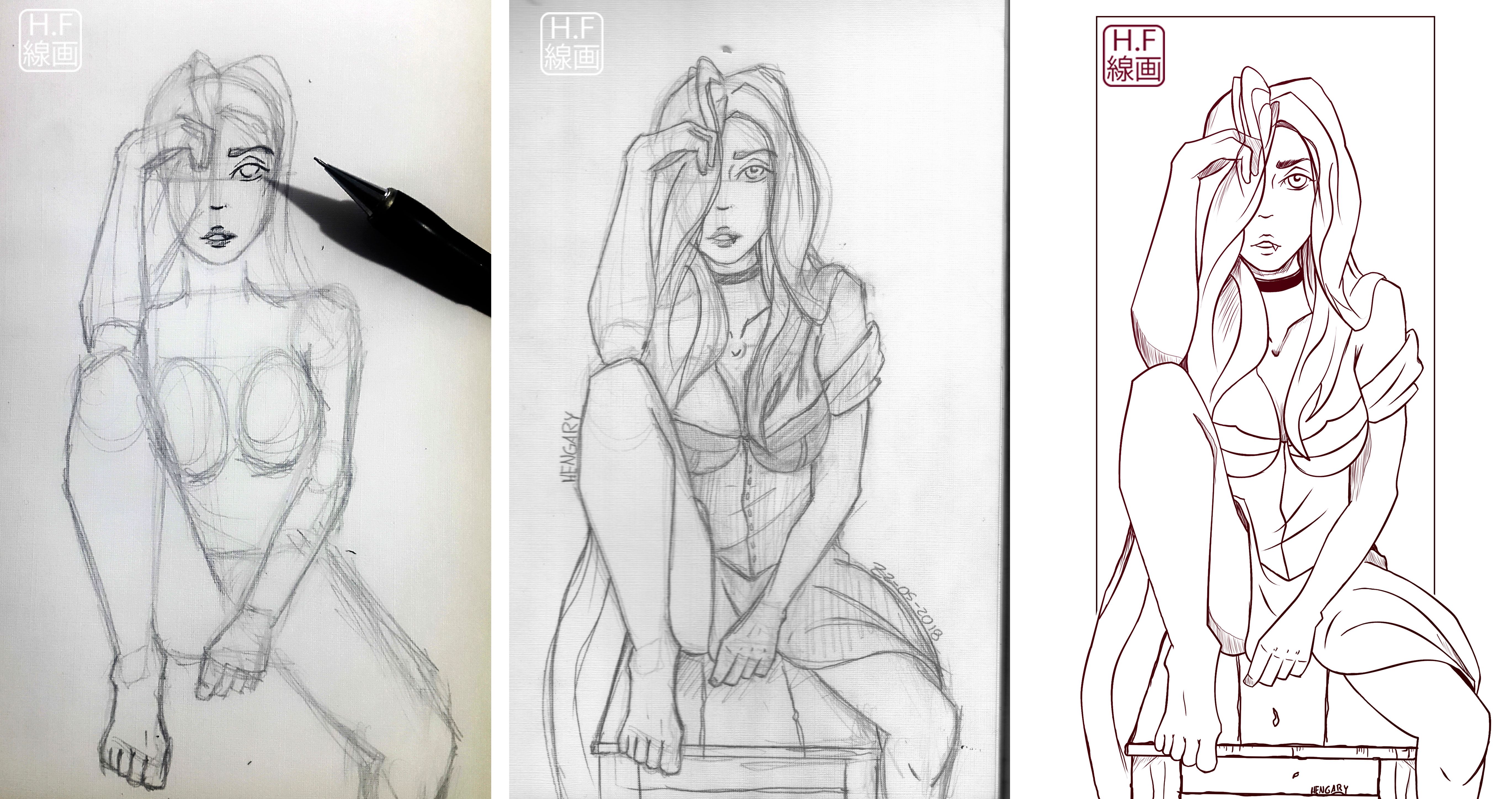 Well this would be my version, from the start skeleton, to the final line art, I have to say that I rarely draw a full body, since I feel that I am not very good at it, but this time I imposed this small challenge, I always say that you have to try to draw outside of your comfort zone, it is the only way to learn new things.