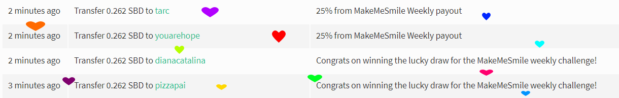 大家好!祝大家星期一愉快 !又是时候派奖了!是的,基本上来讲,只要你有把你帖的链接留在我的公告帖上,你都会赢得一些SBD。我想我们就这样继续下去吧!让更多朋友来参与我们把微笑传播到更远的地方。 所以以以后50%的SBD支付就平均分布给所有的参与者吧!唯一条件就是每一个人不能连续两星期赢奖。非常感谢@williamsyee的长期支持!谢谢你!还有我们的新朋友 @dianacatalina!还有不可忘记的我们的就朋友@pizzapai。爱你们哟!