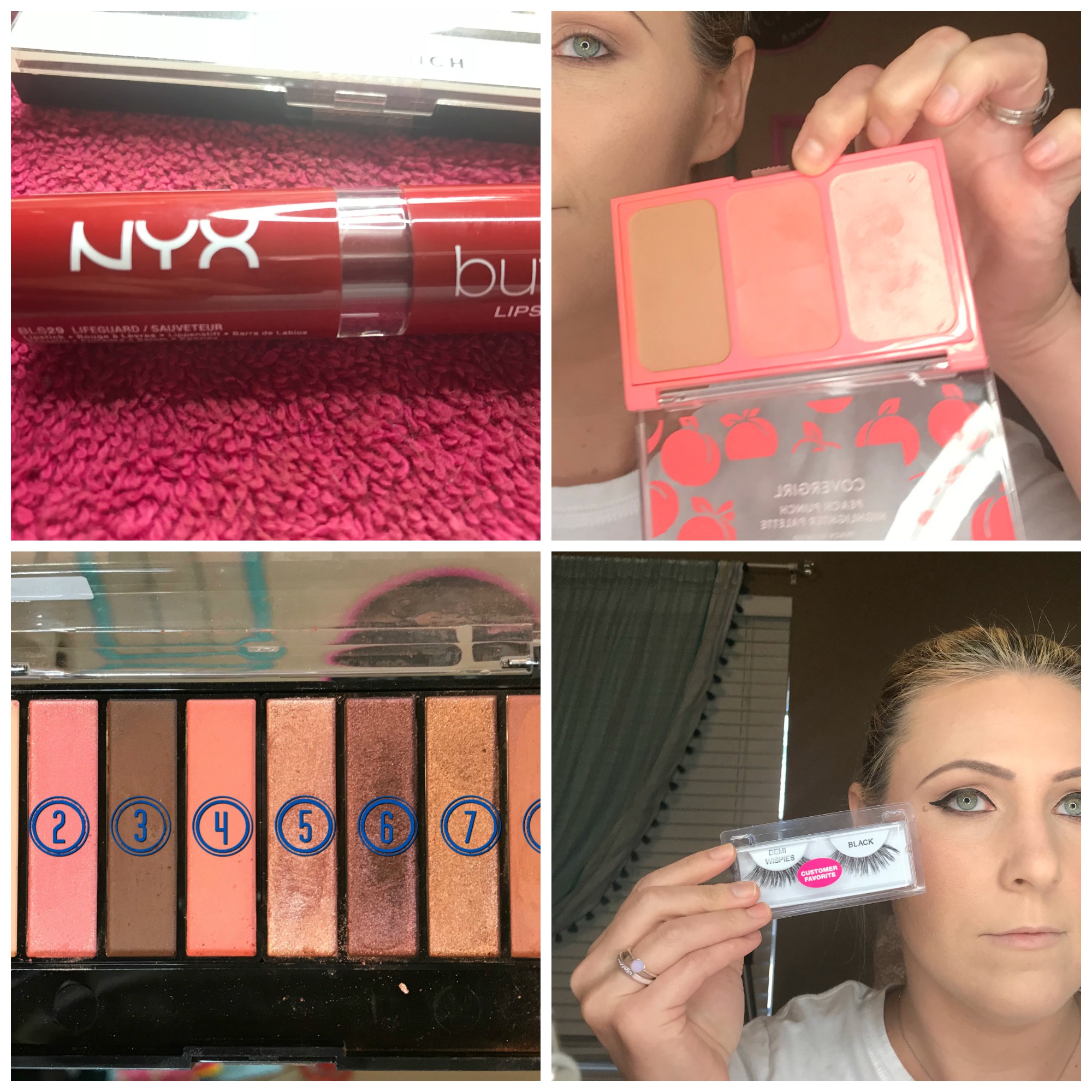 I also used a NYX Butter Lipstick in Lifeguard, the Peach Punch blush pallet for my bronzer, highlight and blush and some Demi Wispies lashes.