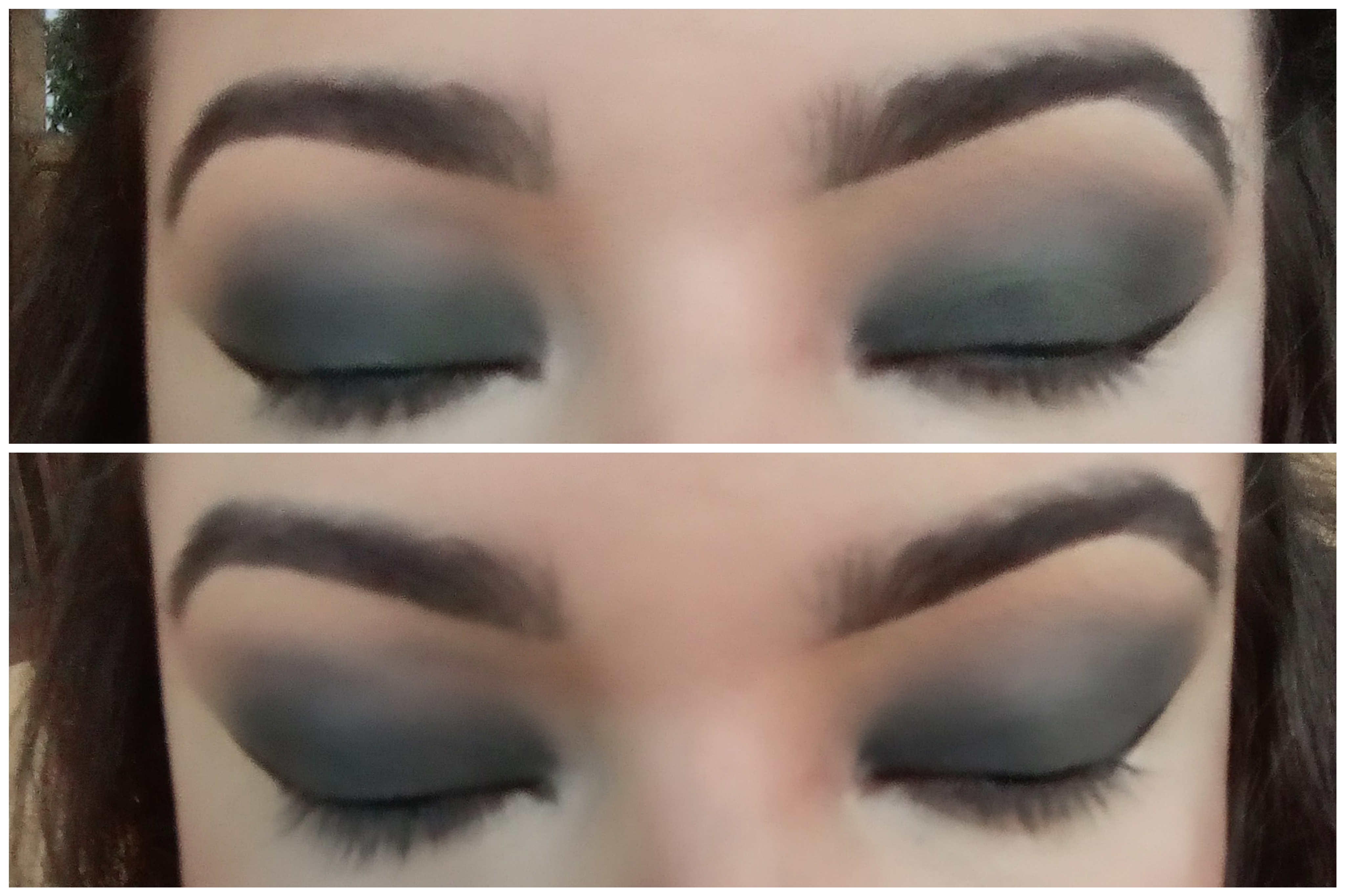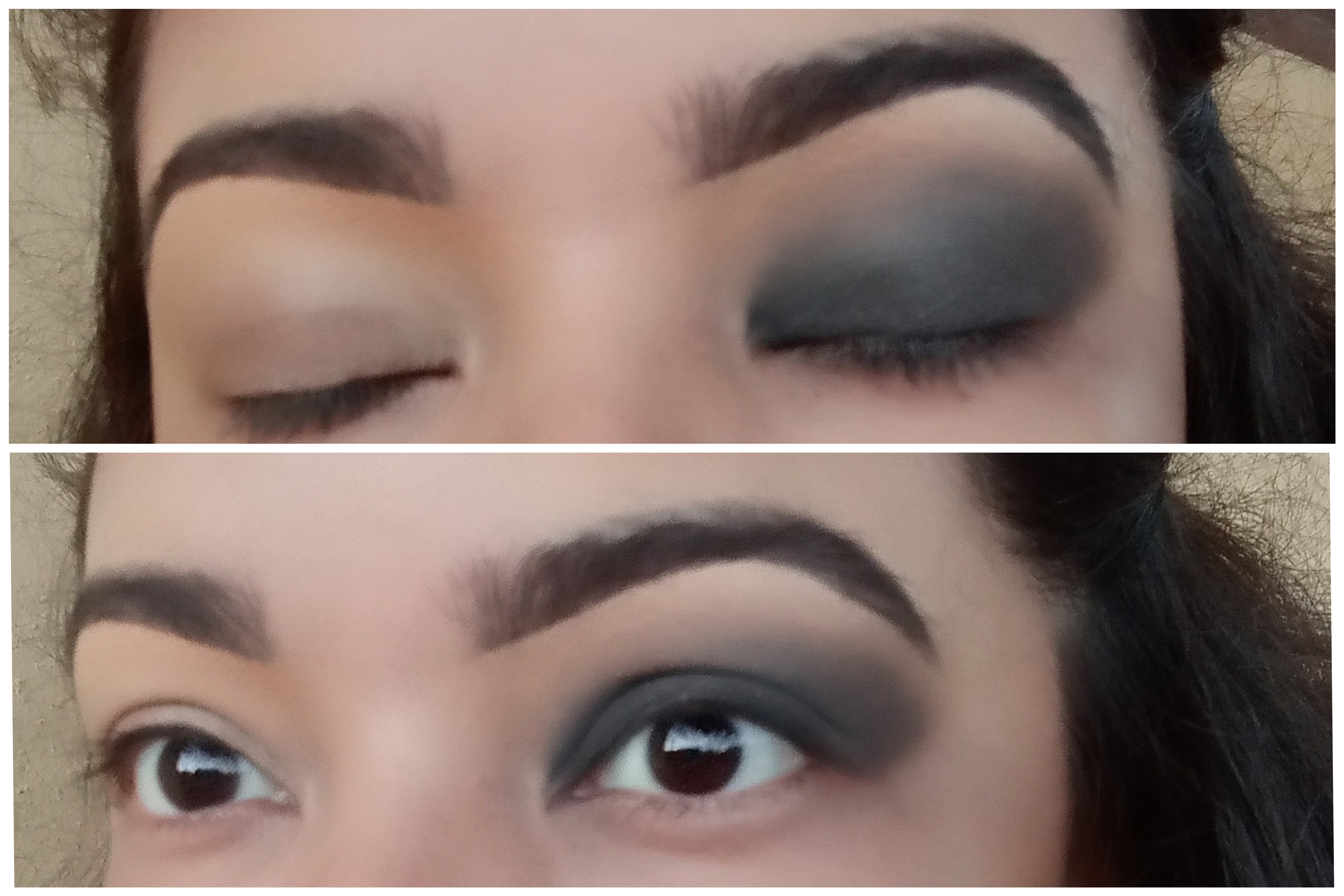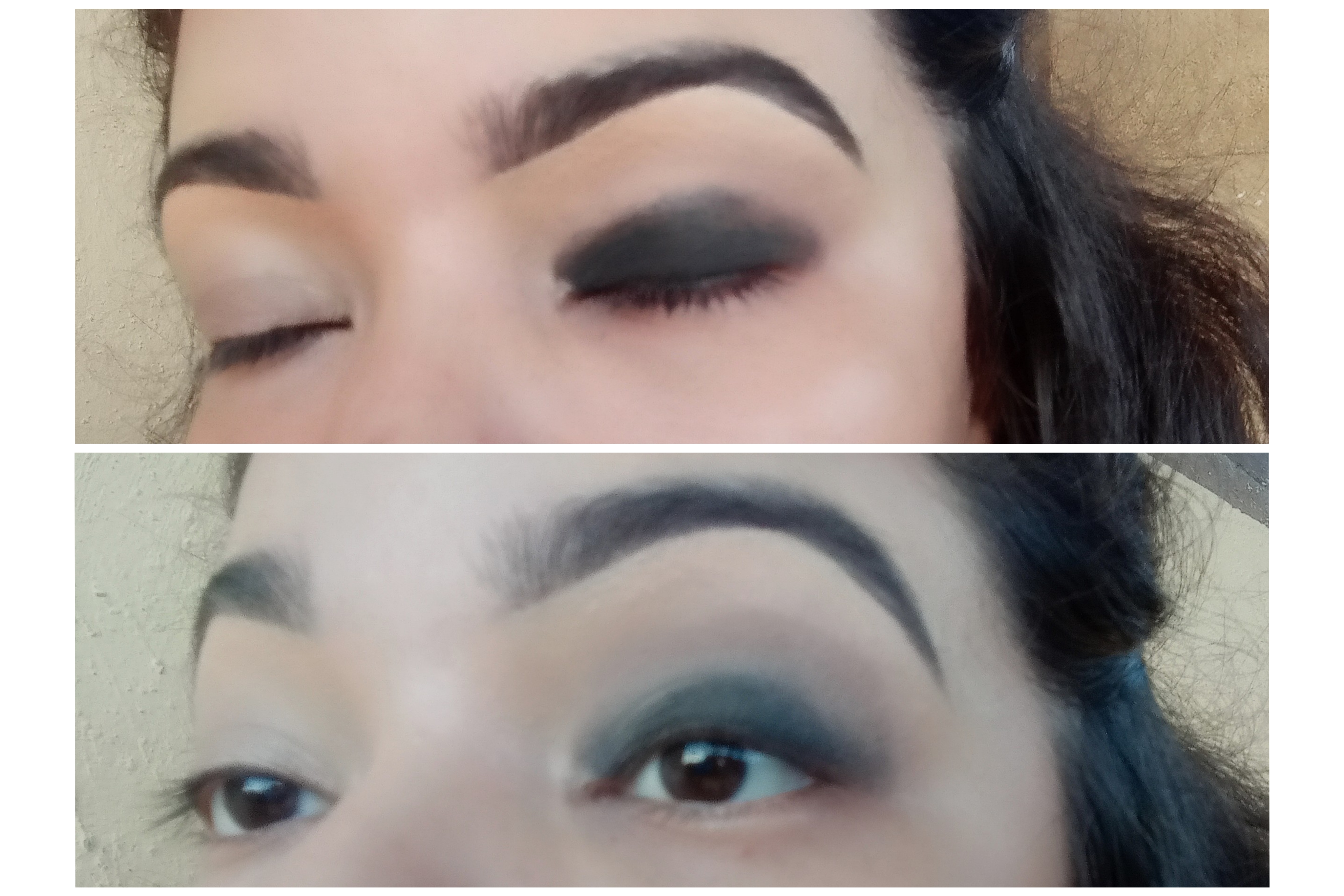 - Lo primero que se deberá hacer será aplicar una pomada o sombra negra (que pigmente mucho) en la zona pegada al nacimiento de las pestañas, en todo el párpado móvil; seguidamente, se aplicará un tono más claro como pueden observar en la segunda imagen (en mi caso, utilicé marrón) también se puede variar con otros tonos como lo pueden ser el “vino”, entre otros.