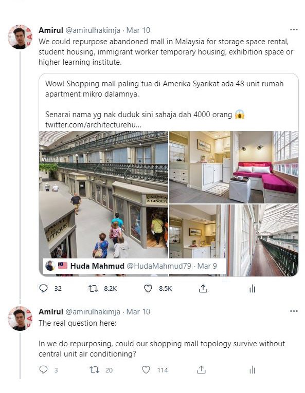 We could repurpose abandoned mall in Malaysia for storage space rental, student housing, immigrant worker temporary housing, exhibition space or higher learning institute.