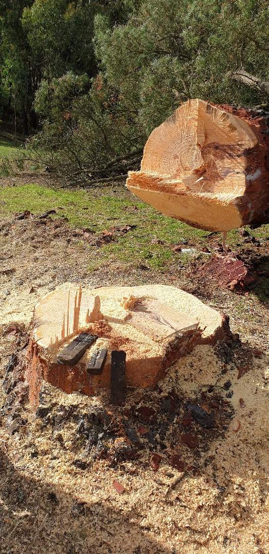 The same method of split-level back cut was used again. With the wedges in place it only took just a few swings of the sledge hammer to bring it down.