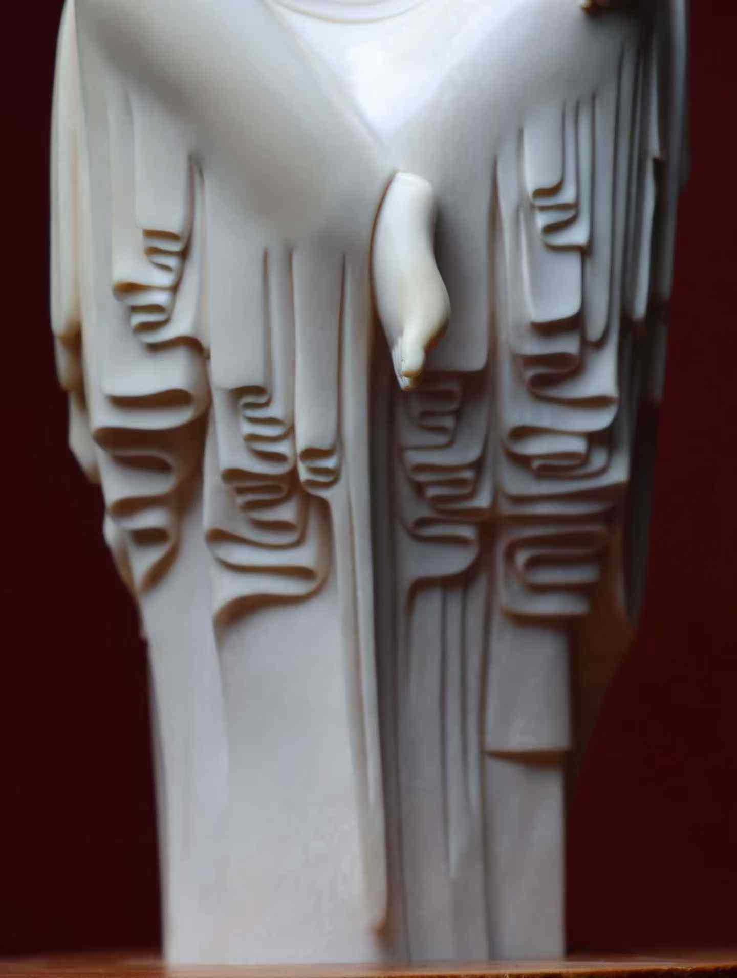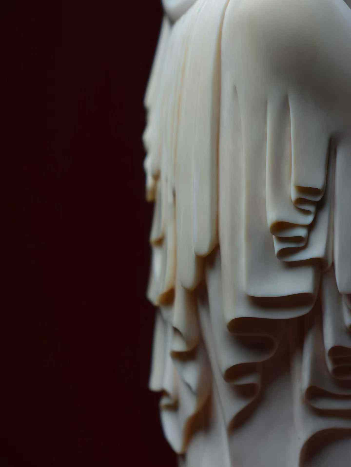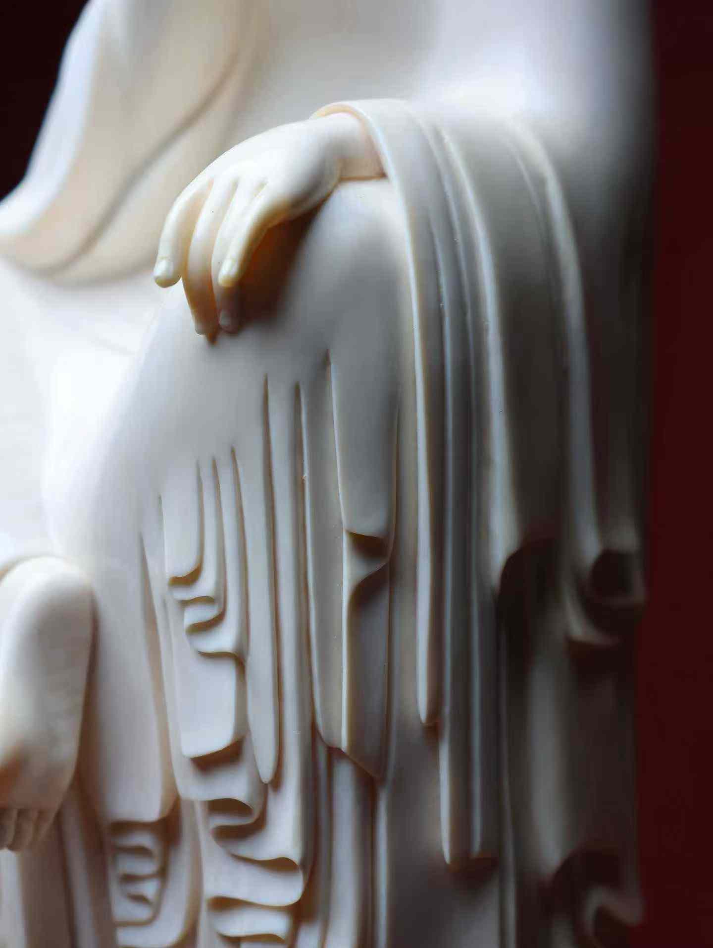 Ksitigarbha Bodhisattva | Mammoth Ivory Carving The ivory is smooth and lustrous, like jade. The Bodhisattva's brows are lowered, his robes flow in layers, and the jewel's radiance shines within. The carving is serene and compassionate, a perfect piece for altar offerings, purifying the mind and revealing one's true nature.
