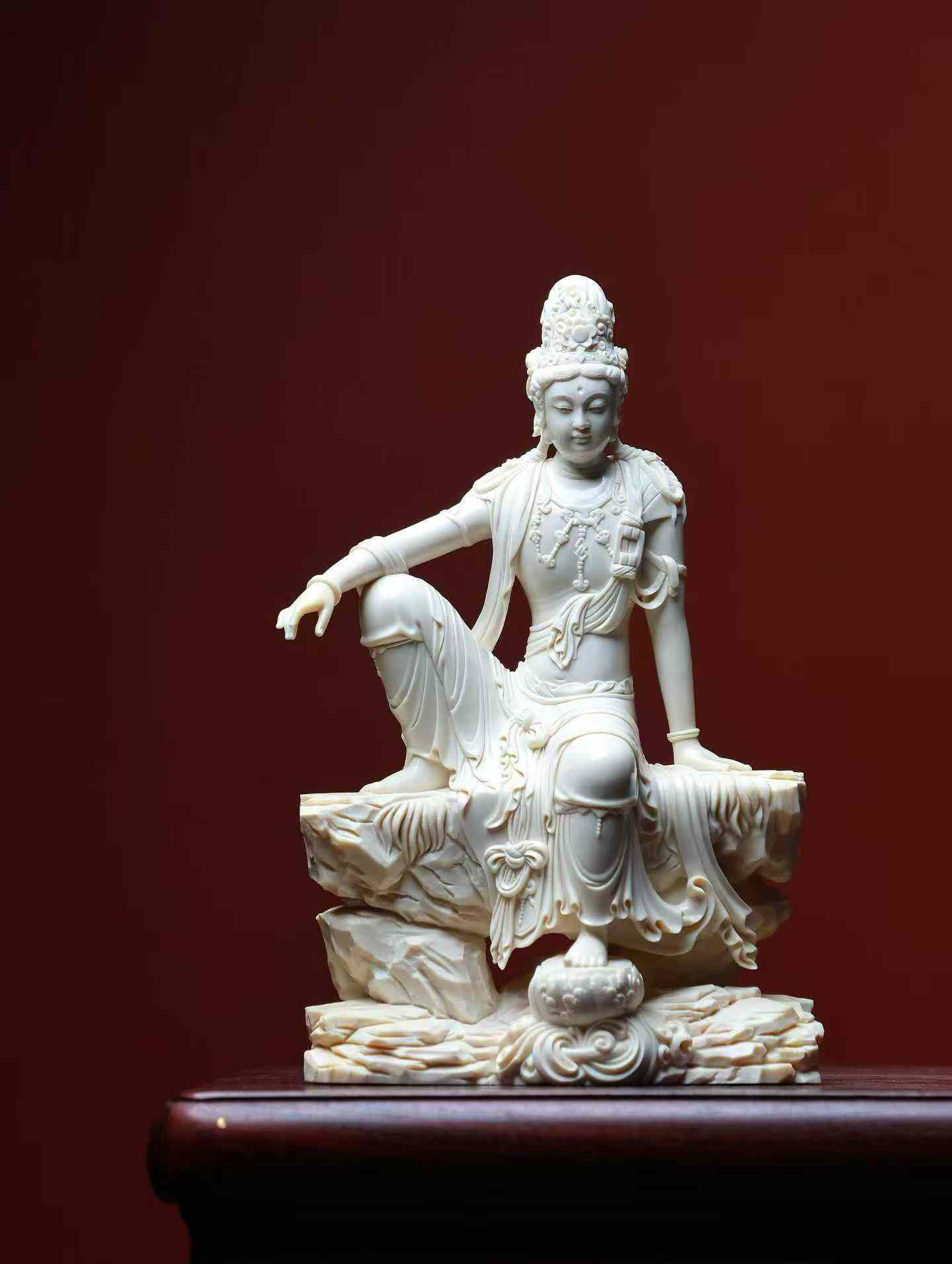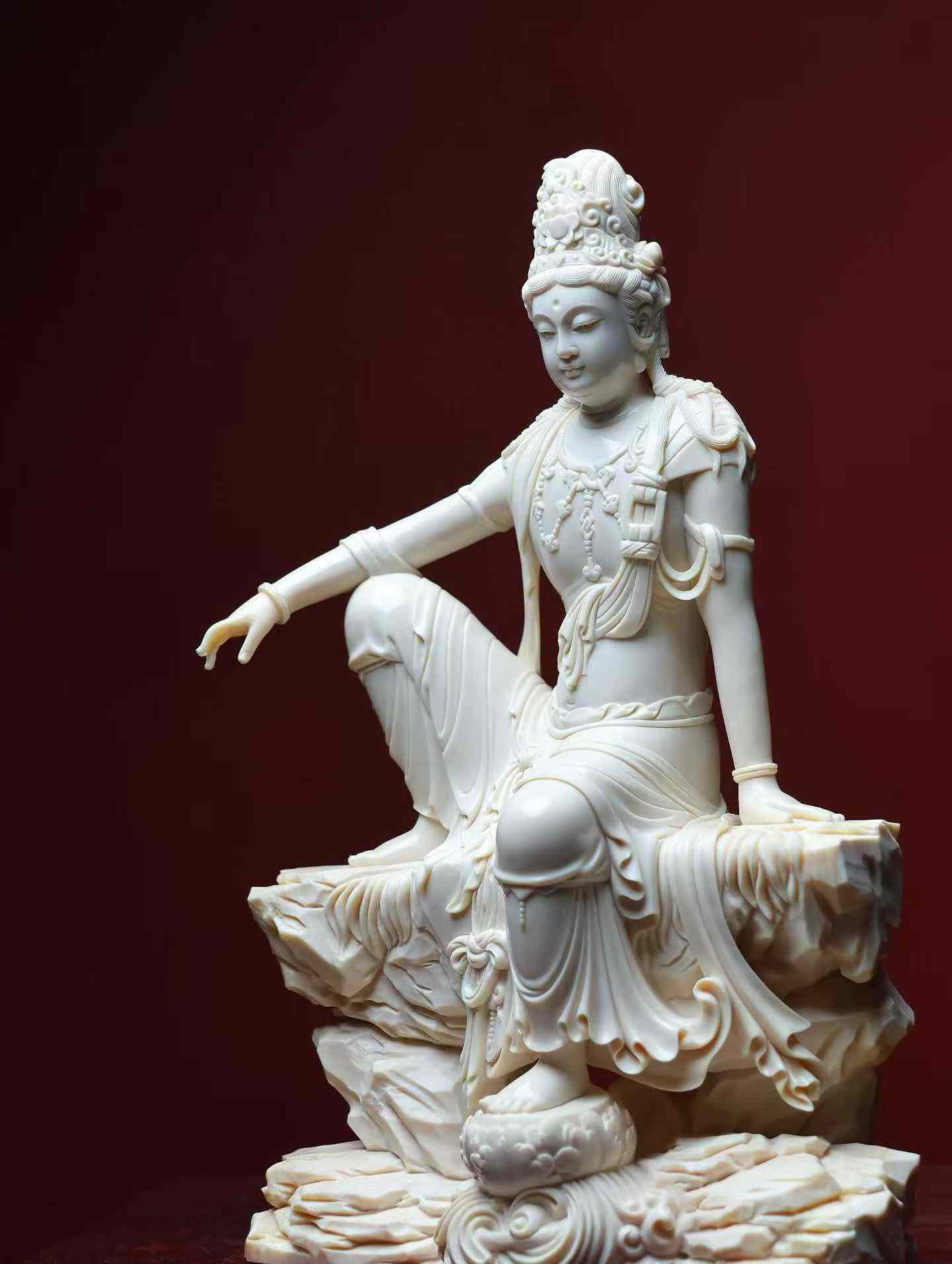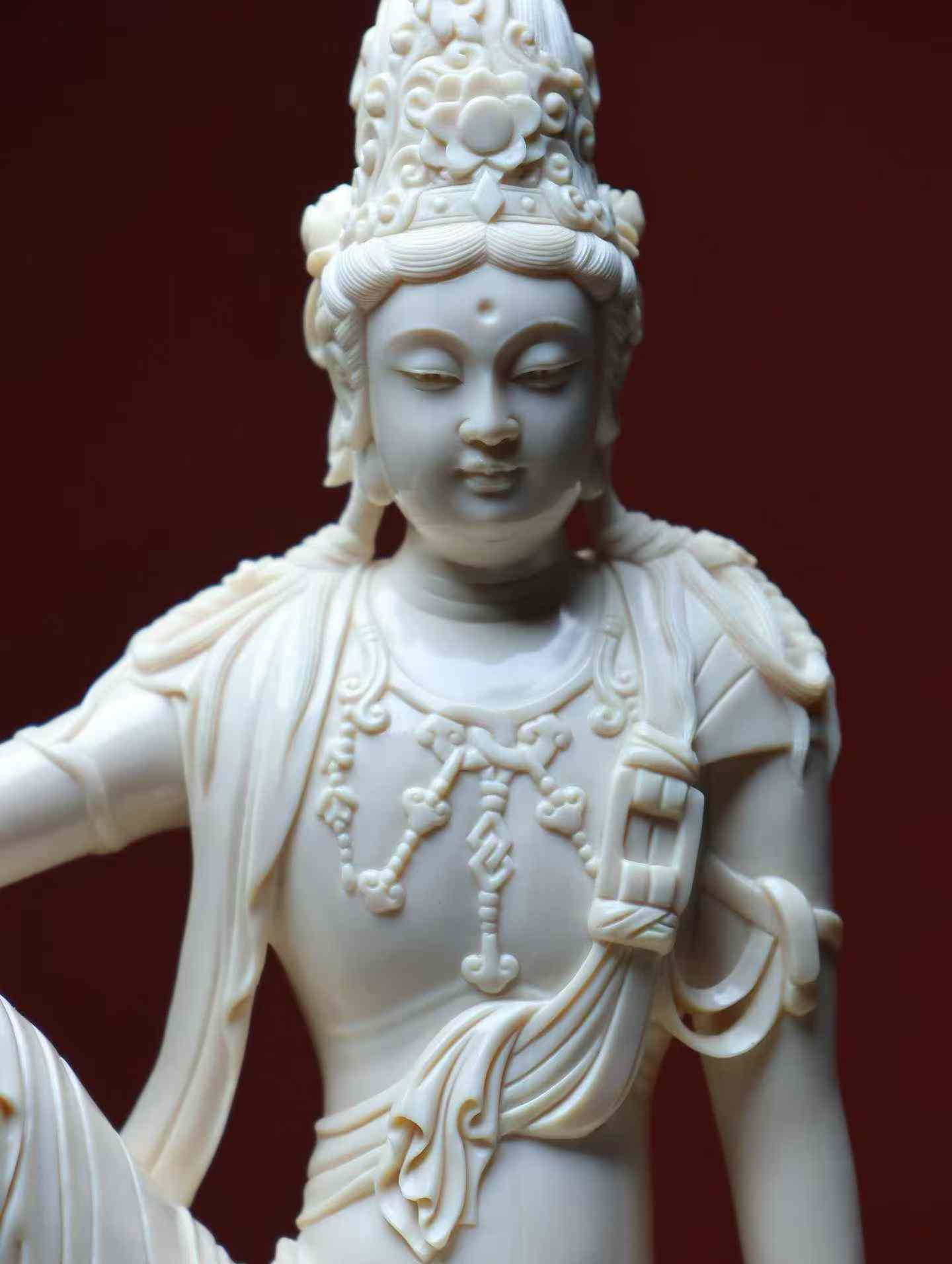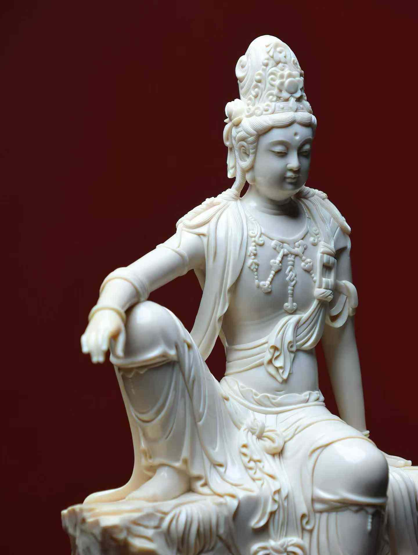 Water-Moon Guanyin | Mammoth Ivory Carving A replica of a Liao Dynasty carving, currently housed in the Nelson-Atkins Museum of Art, made from a single piece of ivory. This Water-Moon Guanyin statue is crafted from premium 5A grade ivory. The carving emphasizes the female characteristics of the Guanyin, who wears a high floral crown adorned with a Buddha image, has a bare upper body with a cloud-like shawl, and is decorated with necklaces on her chest and knees. Her expression is serene, with a rounded, elegant face, elaborate ornamentation, and graceful posture.