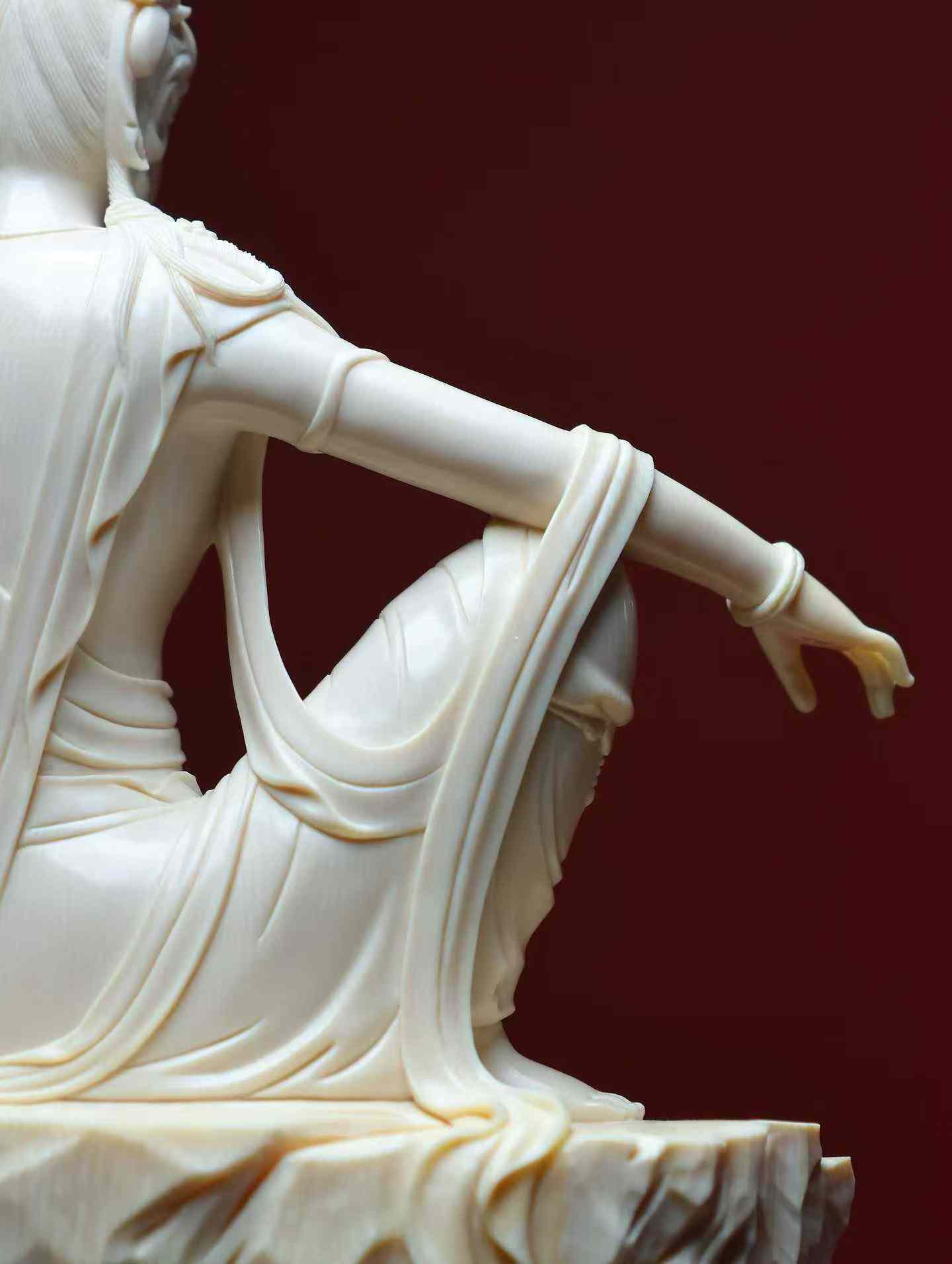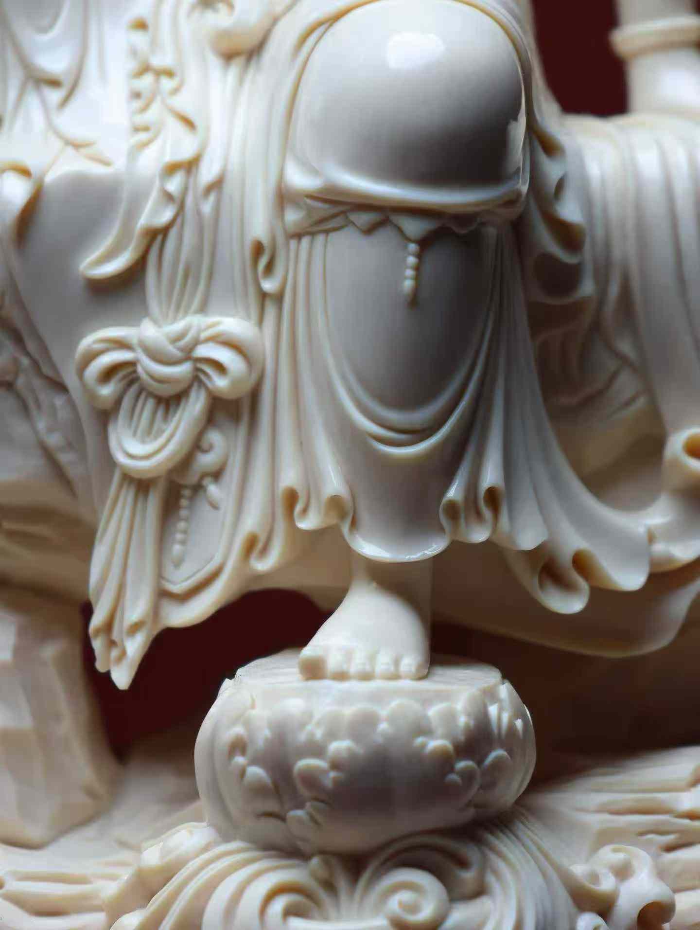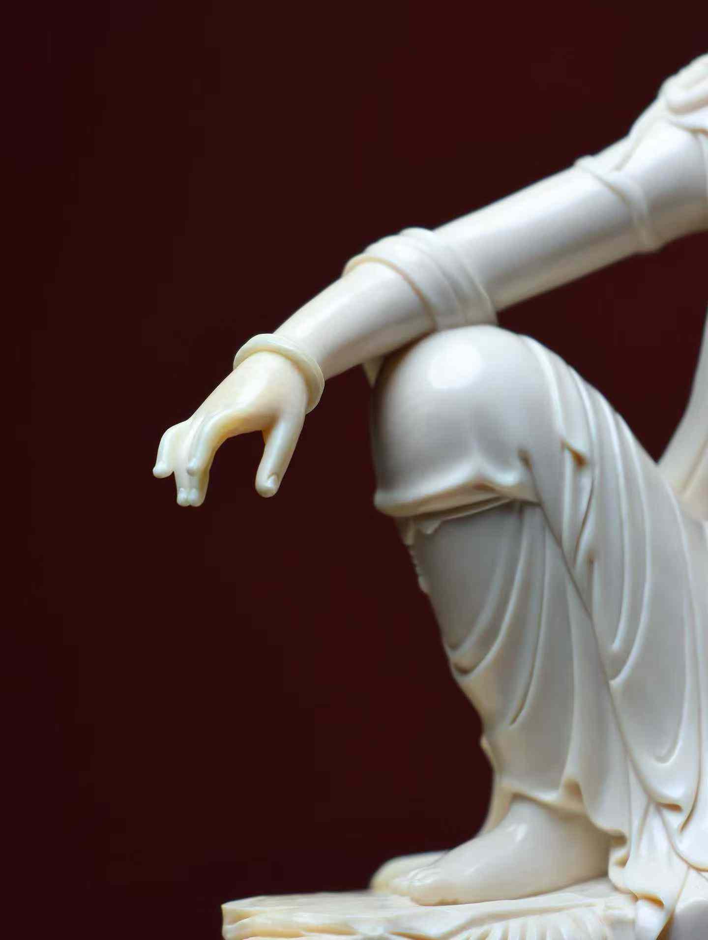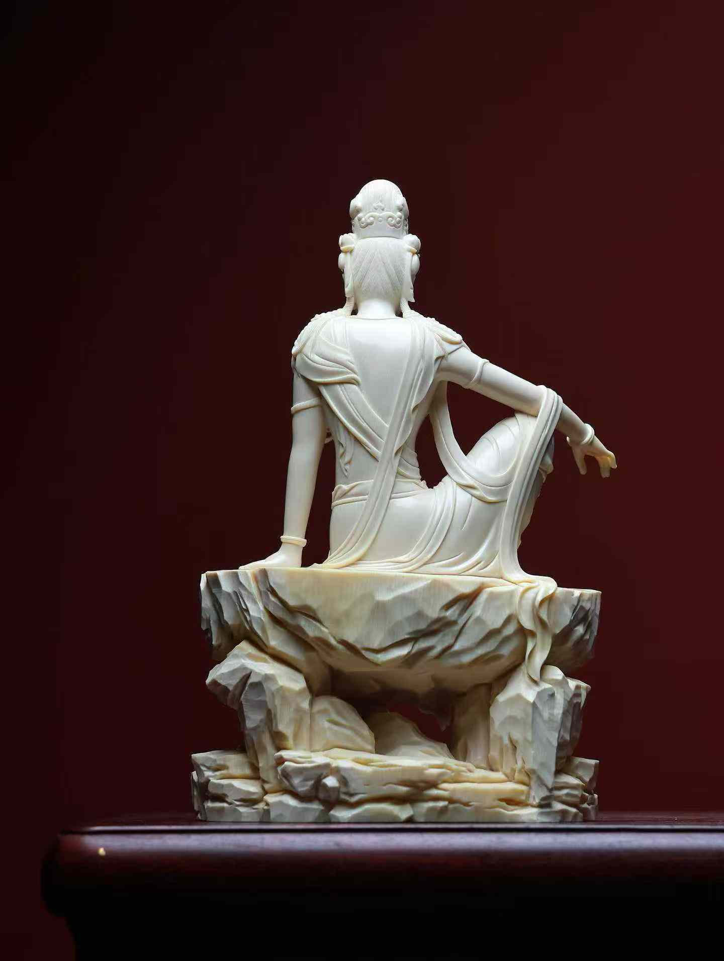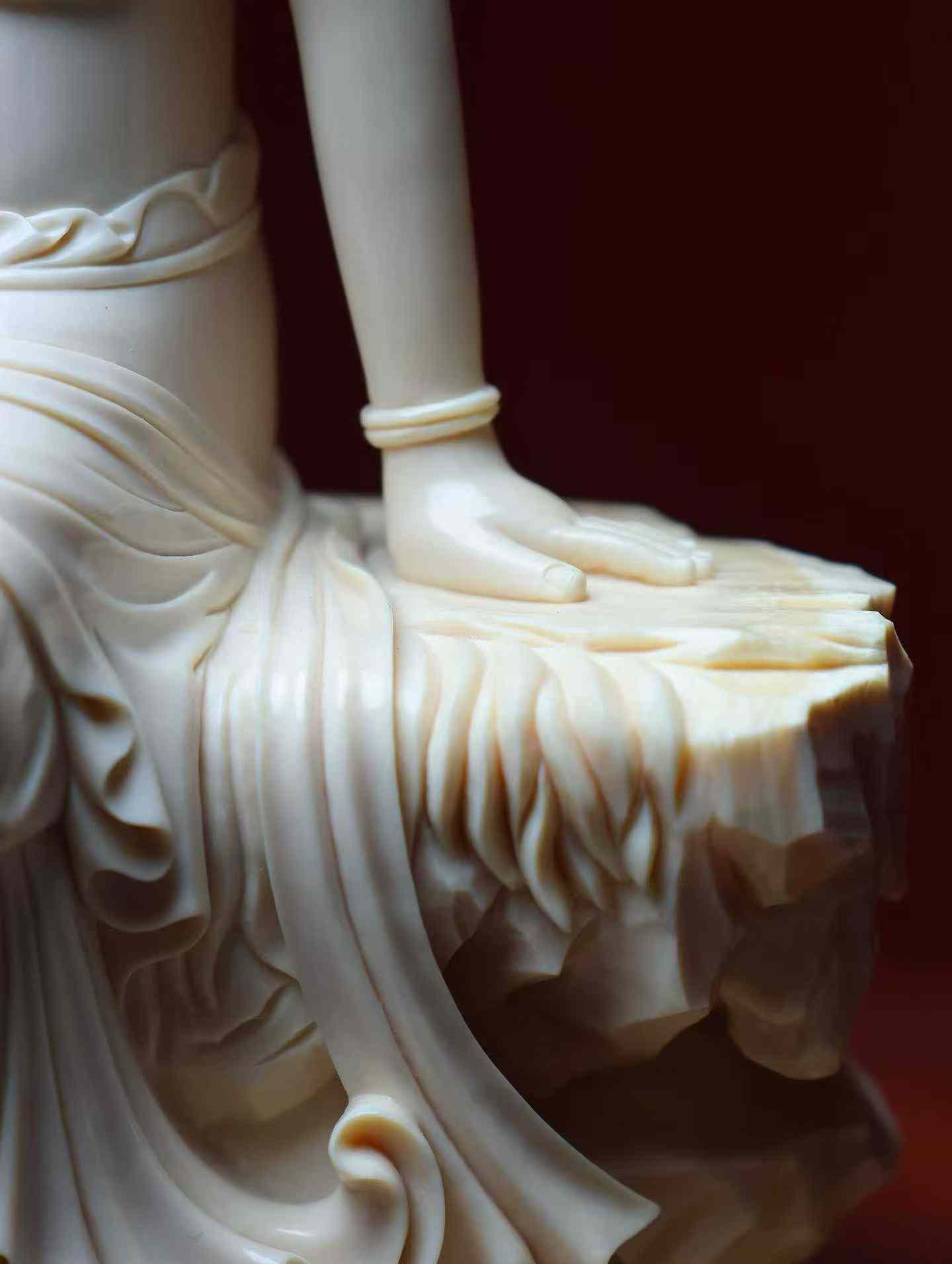Water-Moon Guanyin | Mammoth Ivory Carving A replica of a Liao Dynasty carving, currently housed in the Nelson-Atkins Museum of Art, made from a single piece of ivory. This Water-Moon Guanyin statue is crafted from premium 5A grade ivory. The carving emphasizes the female characteristics of the Guanyin, who wears a high floral crown adorned with a Buddha image, has a bare upper body with a cloud-like shawl, and is decorated with necklaces on her chest and knees. Her expression is serene, with a rounded, elegant face, elaborate ornamentation, and graceful posture.