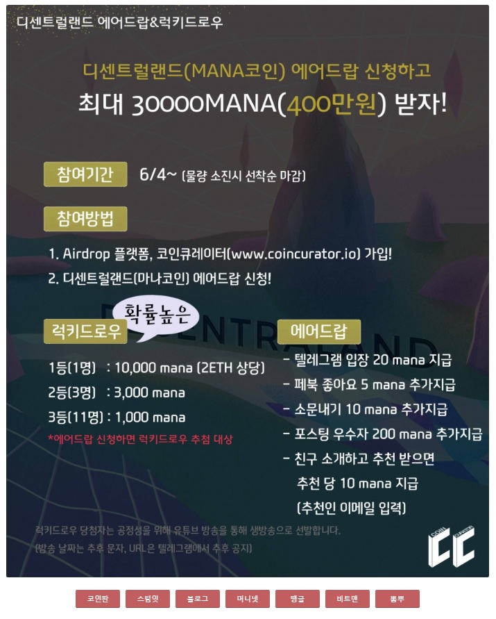 ○참여방법 : Airdrop 플랫폼, 코인큐레이터 https://www.coincurator.io 가입하기 >디센트럴랜드 에어드랍 신청