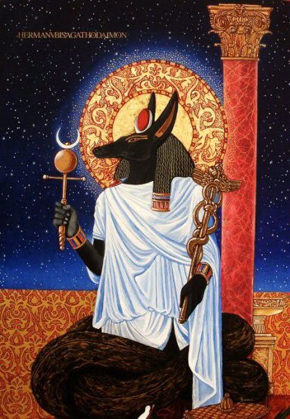 This gorgeous rendition of Hermanubis is by the talented occult painter, Stuart Littlejohn, and can be purchased at his Redbubble storefront.