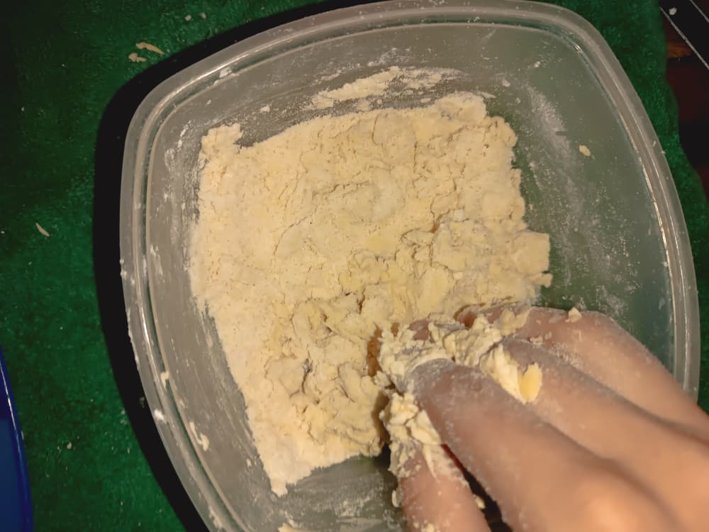 Con la punta de los dedos empezamos a unir todos los ingredientes y haciendo una masa seca que en un inicio se siente granulada pero vamos usando la técnica de la punta de los dedos para que sea mas facil.