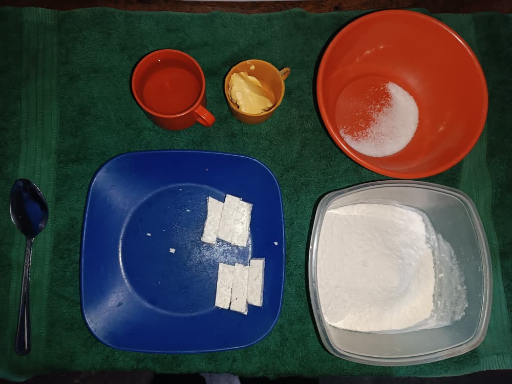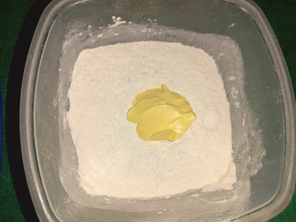 A la harina se le hace como un volcán en el centro donde pondremos la margarina, sal y azúcar. Estos serian los ingredientes secos .