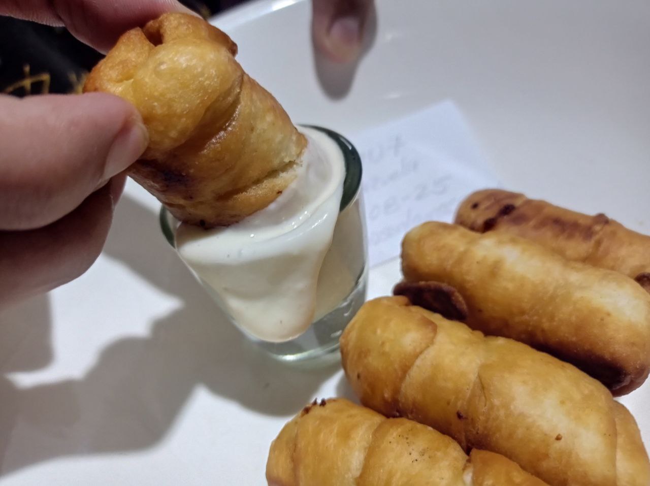 La acompañe con una salsa de ajo espesa. Es muy sabroso y le da mas sabor a los tequeños para que sea un delicioso aperitivo.