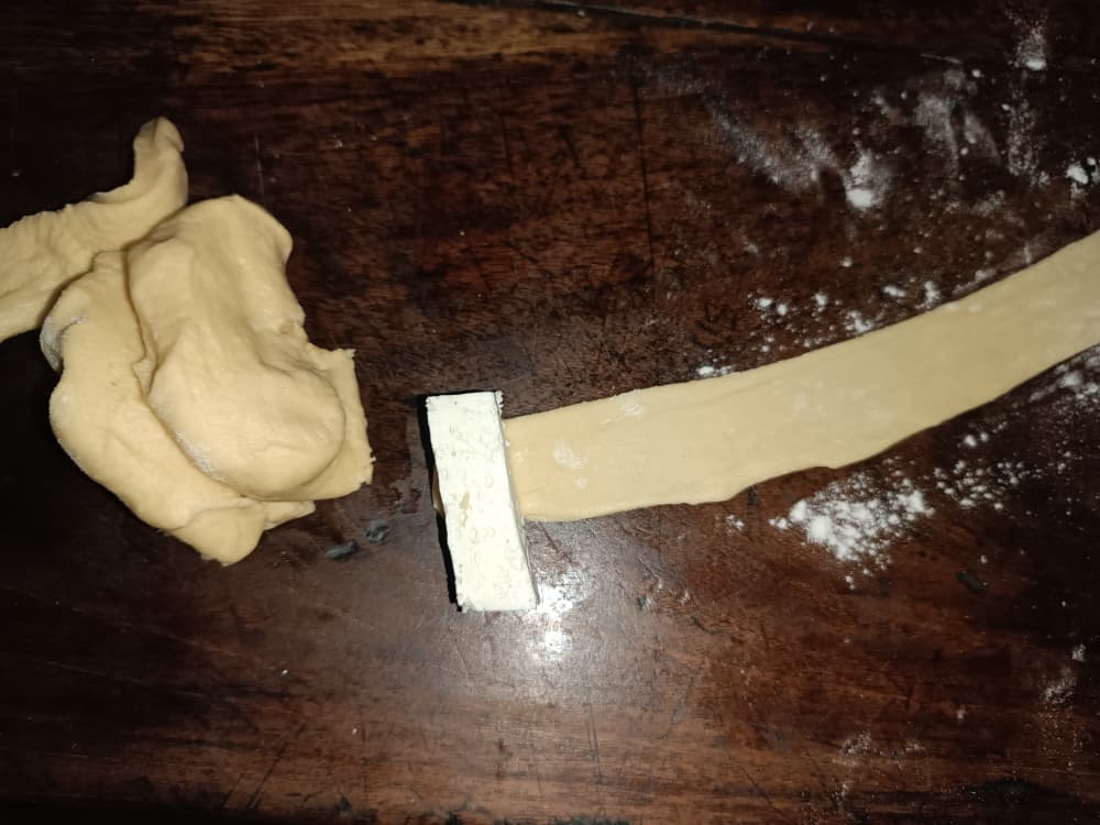 Después del tiempo que la masa se refrigero se siente mas suave y procedí amasar estirando la masa con un rodillo dejándola delgada como una capa de 1.5 milímetro o menos es mejor, también corte los trozos de queso en palitos para envolverlos con las tiras de la masa.