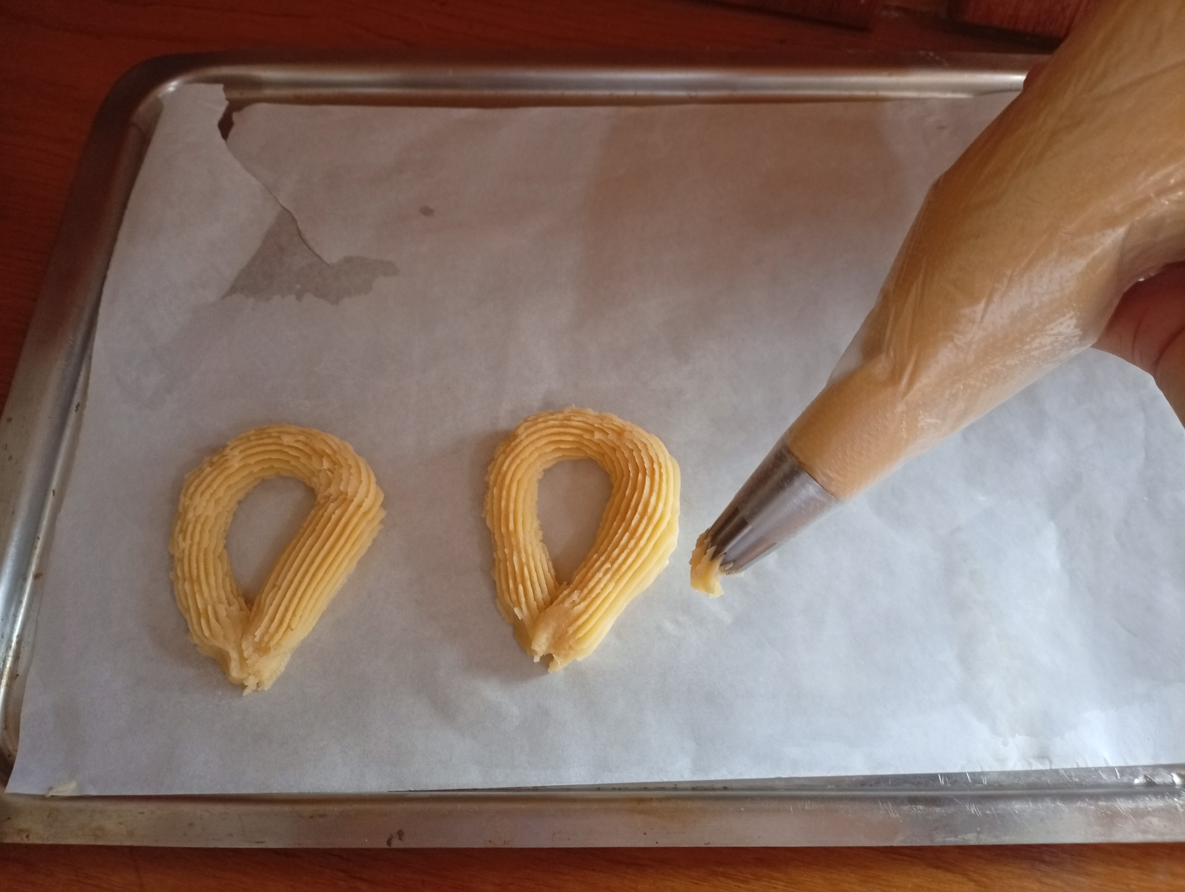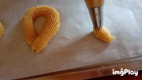 Para finalizar coloqué el una manga desechable la mezcla y reforce con otra manga pero está si tenía boquilla o duya, use la coloqué en una bandeja papel de horno y le agregué aceite para hacer la forma de los churros y luego pasarlos a freír, les di forma de gota y el tradicional churro, la masa estaba muy suave y no sentí mayor dificultad.