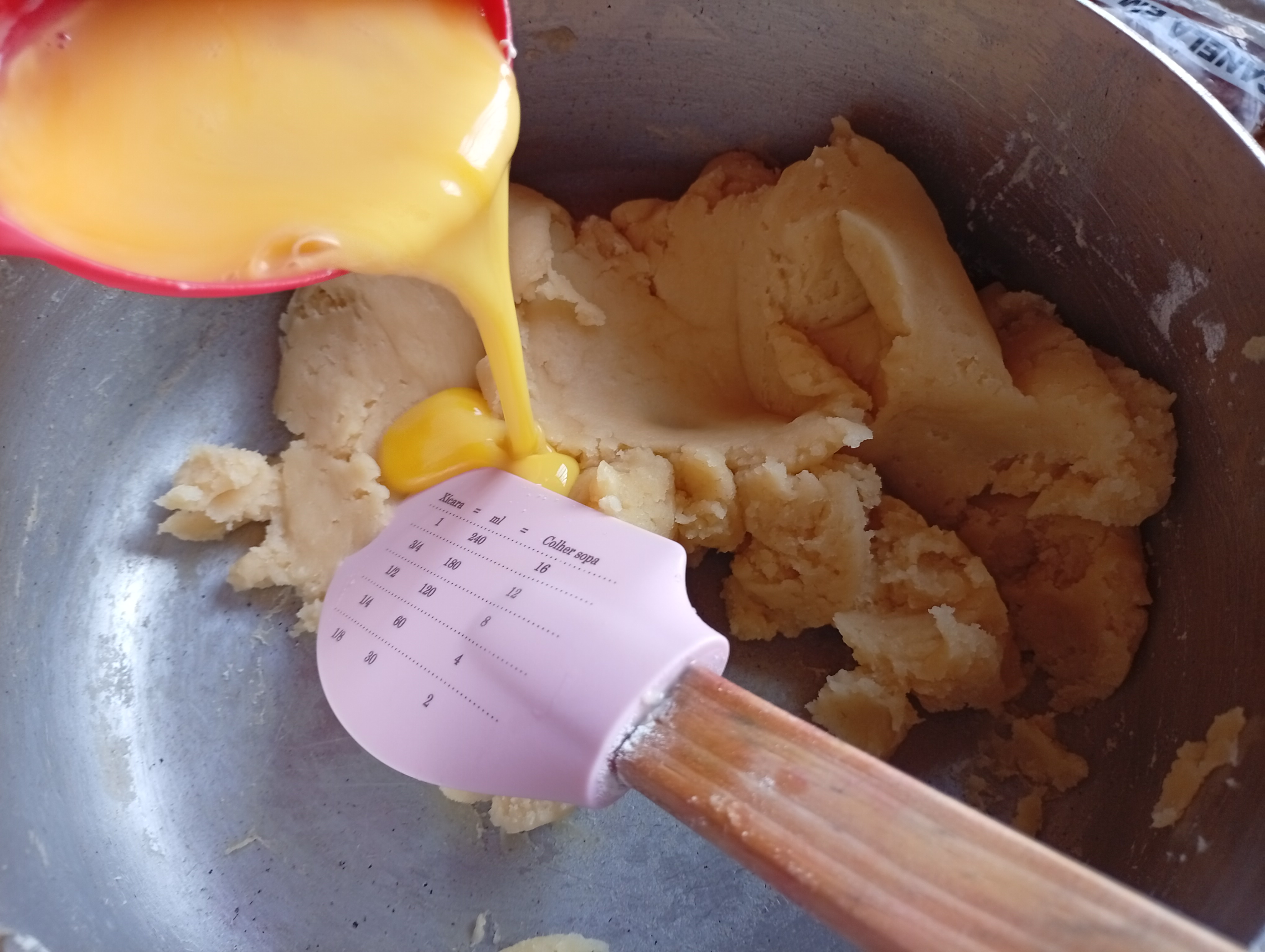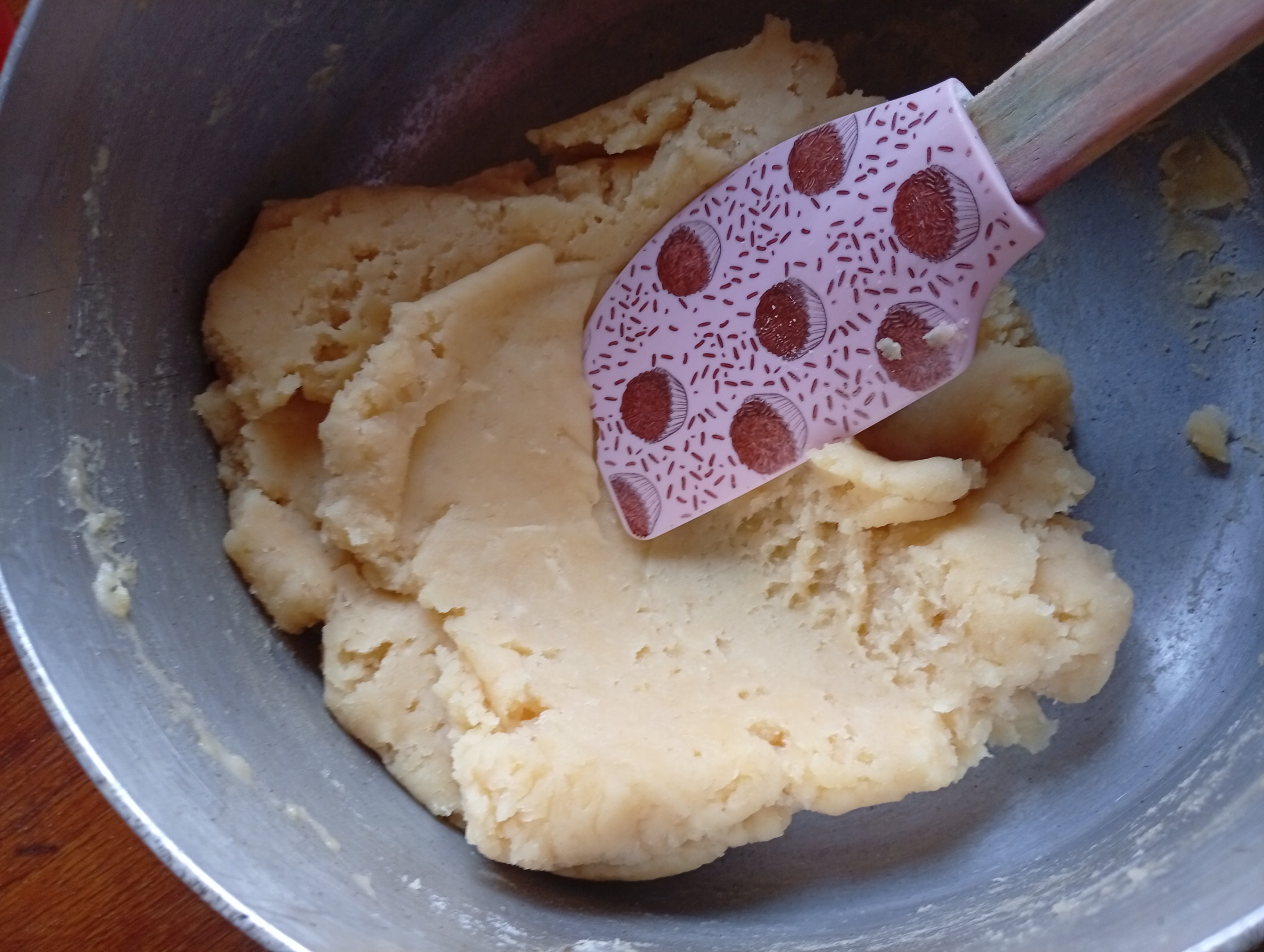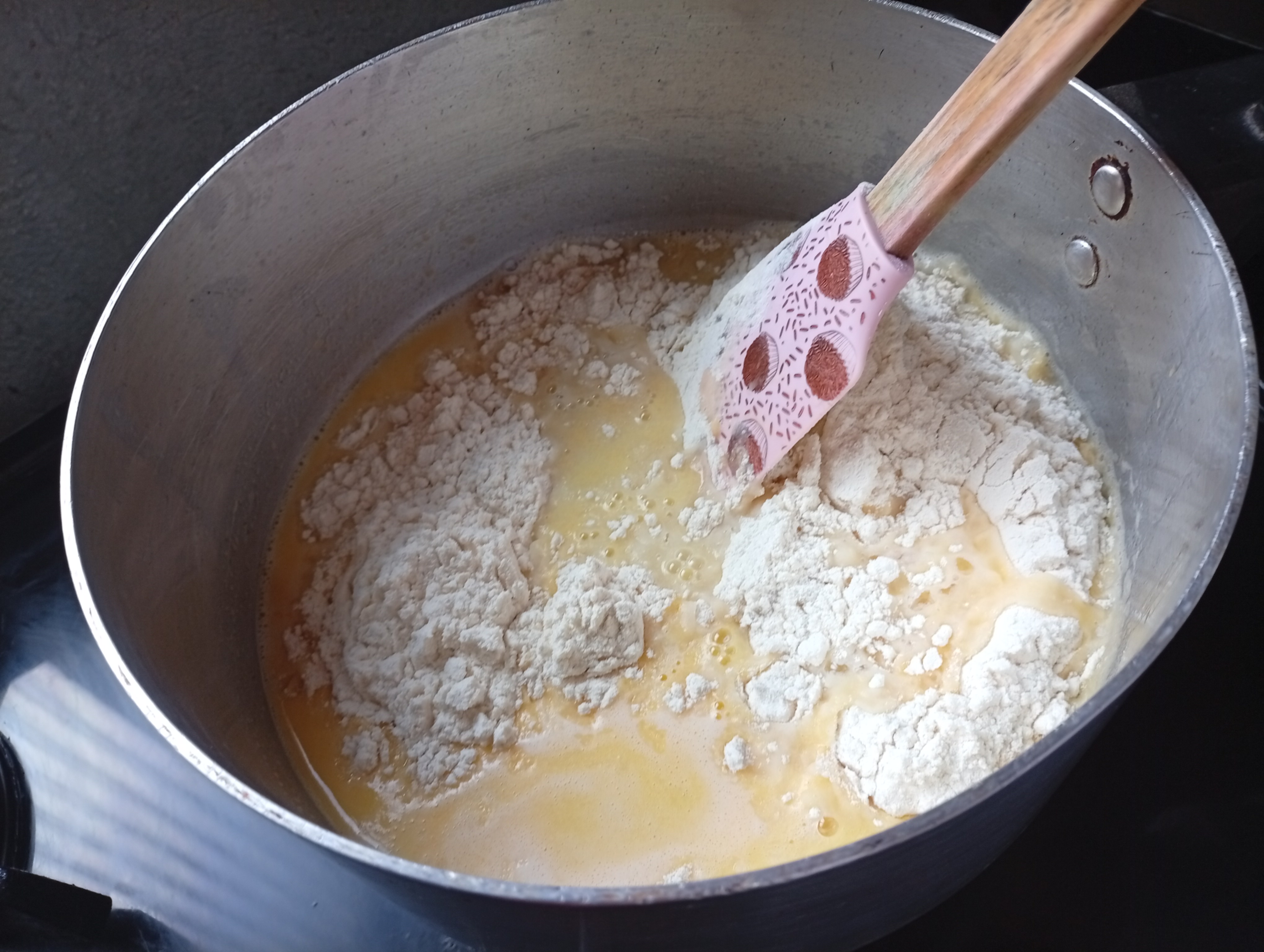 Apagué el fuego y deje reposar unos minutos y agregué el huevo previamente batido, la mezcla se comenzó a cortar un poco pero es normal si seguimos integrando se volverá pastosa nuevamente.
