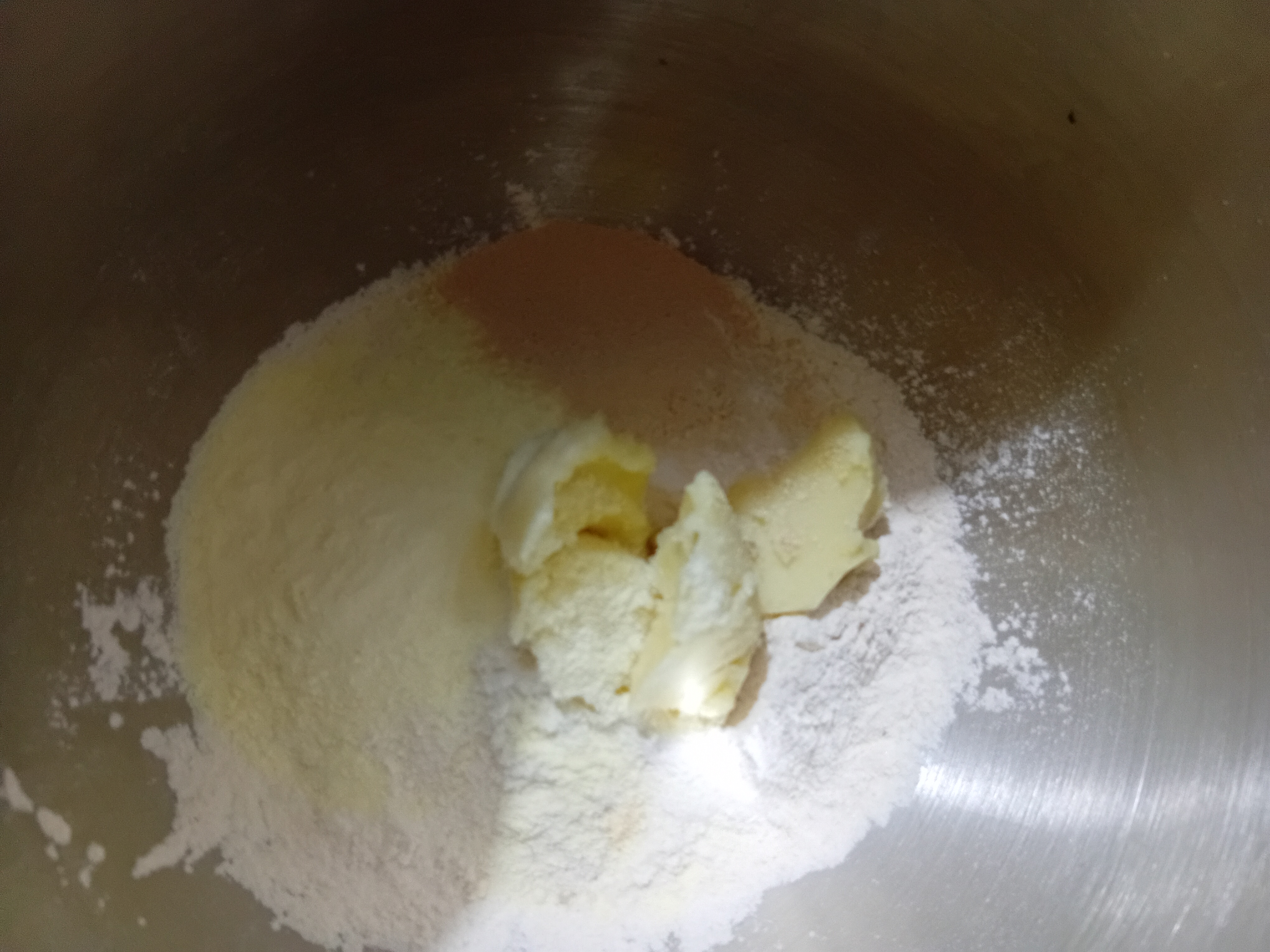 I got all my ingredients measured and ready. I put in my flour, sugar, salt, powdered milk, dried yeast and mashed potatoes into a bowl