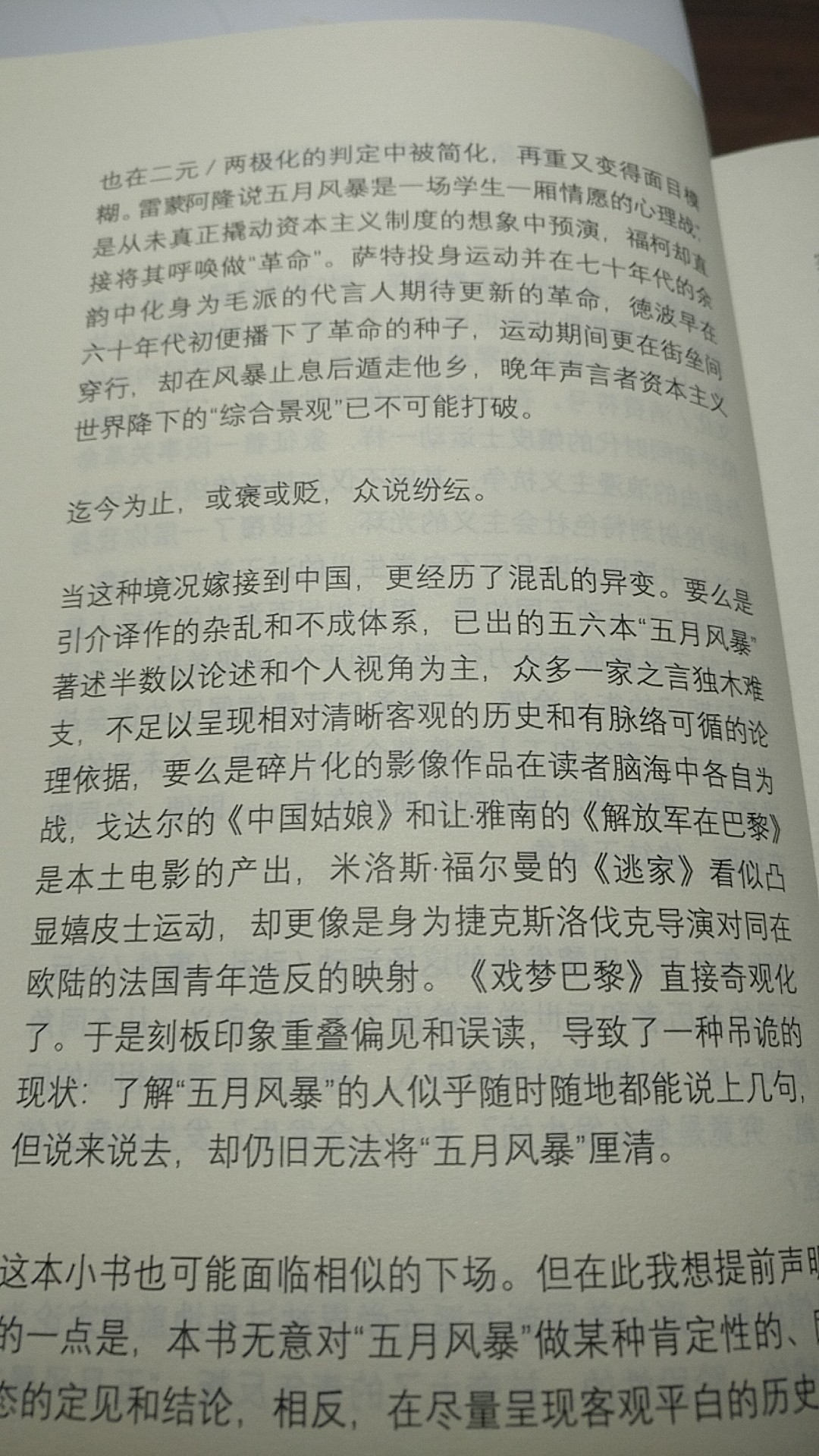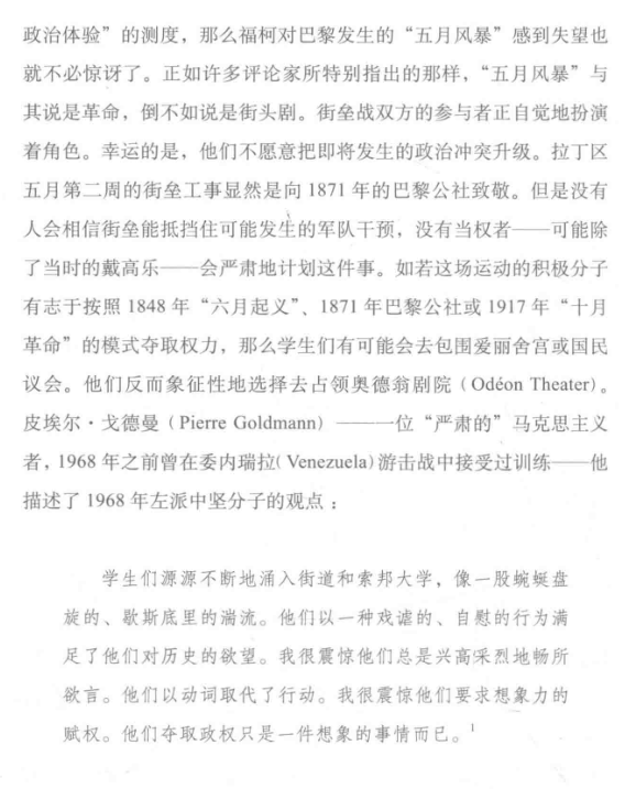 情境主义对学生贫困的状态提出在极权景观下活动议程都被设置了,一旦进入社会就要被劳动异化,而现在商品拜物教已然侵袭日常生活,我们无法生活在真实之中,于是以为中国在大刀阔斧欣欣向荣的文化大革命就成了外来的和尚,虽然知道枪杆子里出政权和革命不是请客吃饭,但上街游行的估计大部分都没有做好面对15年监牢的风险,在《戏梦巴黎》之中表现得很清楚,几乎是《乌合之众》和《狂热分子》的表征,不愿意用实际行动来支持革命,我们只想要想象力夺权的享乐,所以3M(马克思、马尔库塞、毛泽东)沦为符号,据说后来柬埔寨的留法派因为受到这些空想左翼的影响回国之后因为要一举建成共产主义而导致红色高棉大屠杀的悲剧,最近的黄背心运动在我看来也是非常疲软的抵抗,民粹主义席卷了主体性,精英治国的新自由主义到了十字路口,看似是反对政策或税收,本质上还是商品的异化和过劳时代的晚期资本主义戕害,技术宰制和卡钦斯基的后工业社会未来,宏大叙事崩溃之后这些用作谈资的次元符号模糊了现实和虚拟的界限,我称之为“前赛博时代”——身体时刻处于大他者的规训之中,精神上寻找媾和的快感,无论是消费投资的身份认同还是衣食住行的自恋焦虑,资本营销的集体无意识是要对大数据进行精神分析,命运的想象共同体被过度阐释和归附,正常的人性失去尊严,世俗期待秀下限的刺激,浪漫的抒情梦境如同热带雨林或珍稀物种在消逝,行为和经济被量化,新闻和历史不再为了真相而竞争话语权,我希望更多敢于求知和卓越的个体涌现,强烈推荐阿隆的《知识分子的鸦片》和福柯的《主体性与真相》。