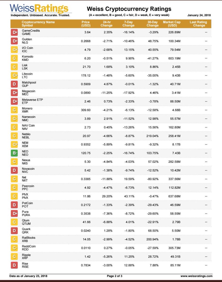 WEISS RATING of All 74 Currencies - ETH / EOS / ADA / STEEM / NEO at the top - TGA Update