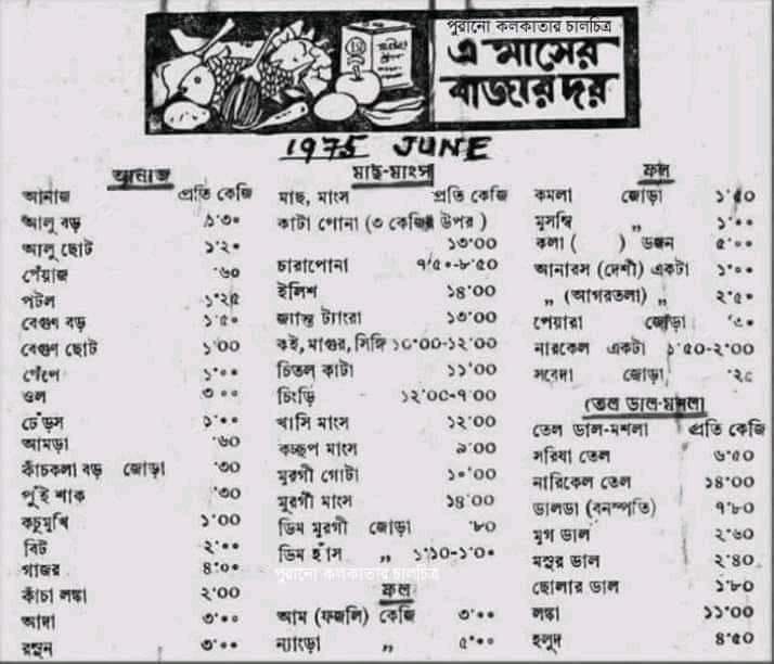 উপরের ছবিটা ভালো করে একটু লক্ষ্য করুন । এটি একটি বহু পুরোনো মাসিক পত্রিকার ছেঁড়া পাতা । এই পাতায় ১৯৭৫ সালের জুন মাসের কোলকাতার বাজার দরের একটা তালিকা রয়েছে । ১৯৭৫ সাল থেকে ২০২৪ - অনেকটাই লম্বা সময় । প্রায় পঞ্চাশ বছর, অর্ধ শতাব্দী । এই সময়ের মধ্যে কোলকাতার বাজার দর অস্বাভাবিক হারে বৃদ্ধি পেয়েছে । তার পেছনের মূল কারণটা কি শুধুই ভারতীয় রুপীর ক্রমাগত দরপতন নাকি আরো কিছু কারণ আছে এর পেছনে ?