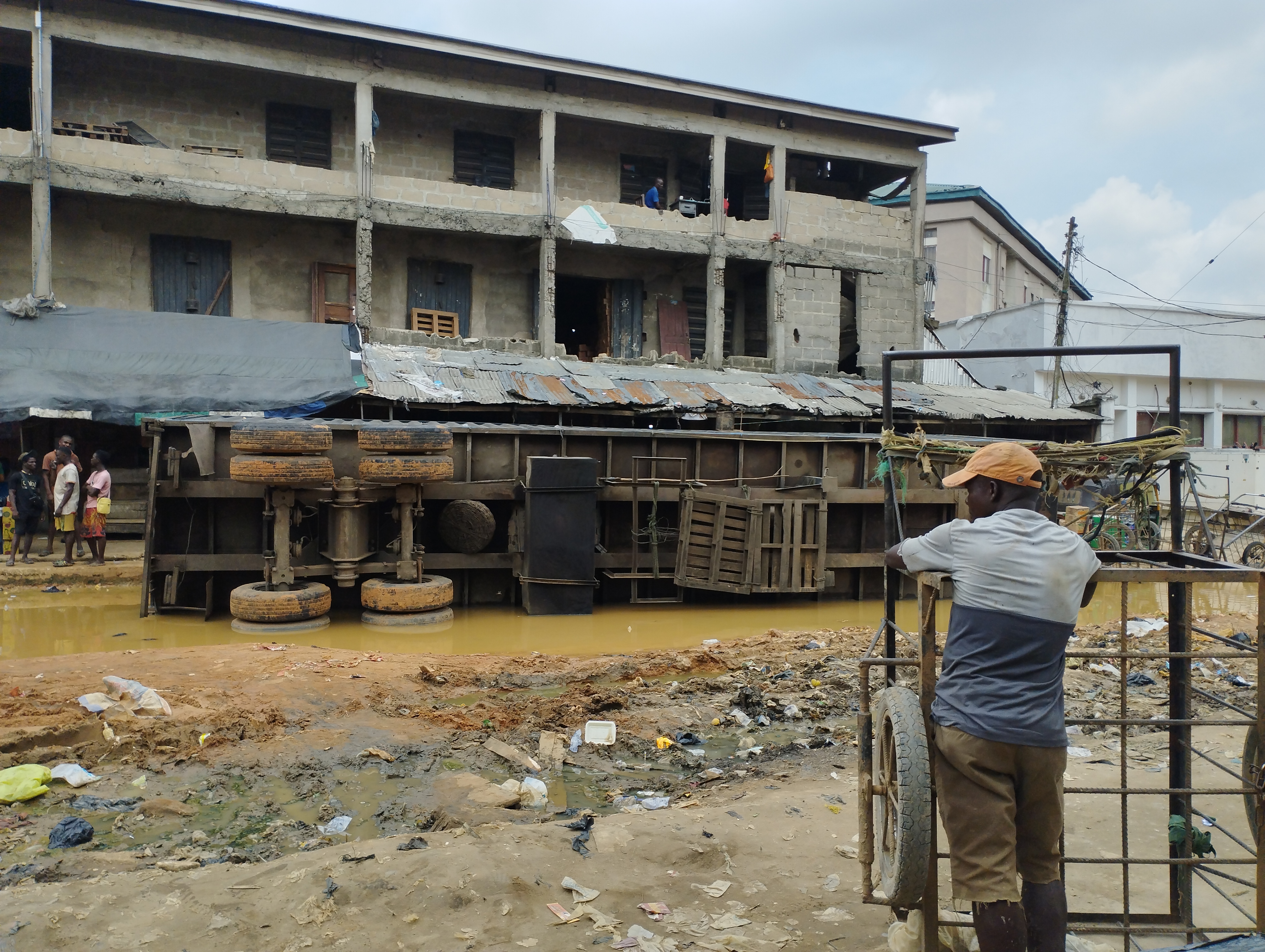 Getting to the deathtrap entrance leading to the Eziukwu (cemetery) market, I was greeted warmly by the image of the fallen heavy duty vehicle below.
