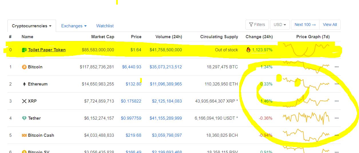 We are doomed with fat a*s price graphworldfinances (61)in #market • 6 years ago No toilet paper token? I think we are doomed ;) Go and check it out on https://coinmarketcap.com/ #steem #joke #token #dlike