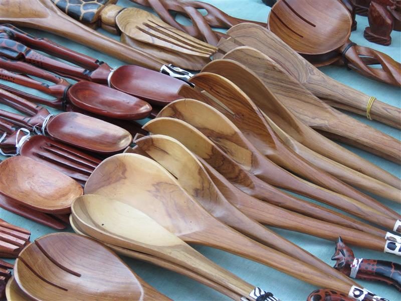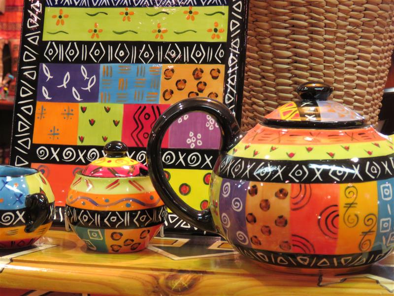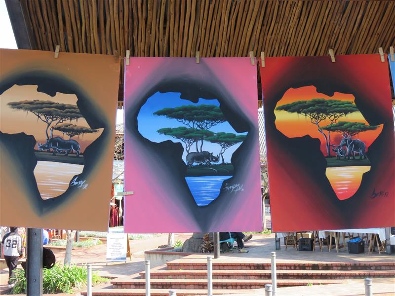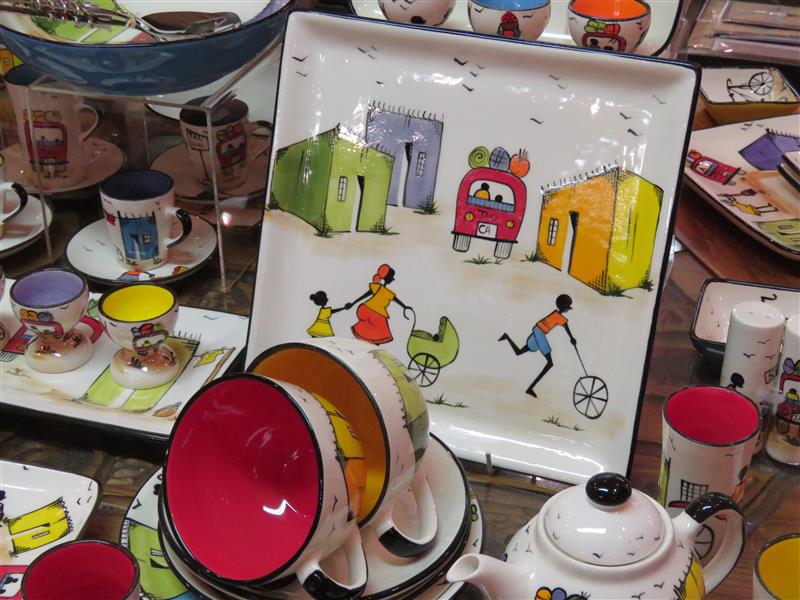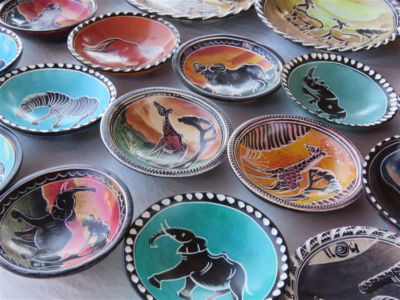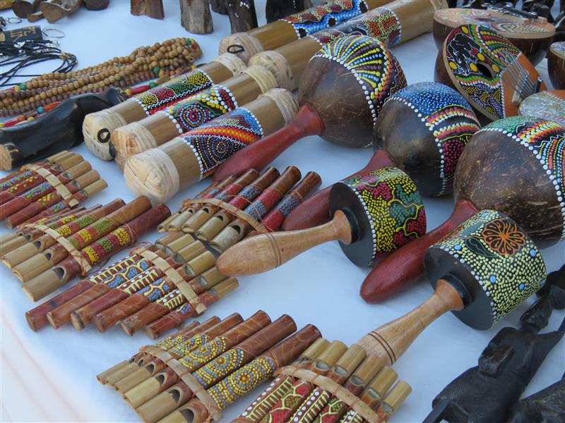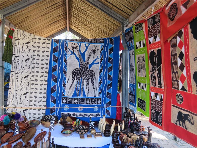 Apart from the very popular South African themed paintings, murals and tablecloths, you can buy beautifully carved wooden bowls and African animal replicas. There is painted clay pottery. Intricately woven bags and skirts. Unique baskets hand woven. Even musical instruments.