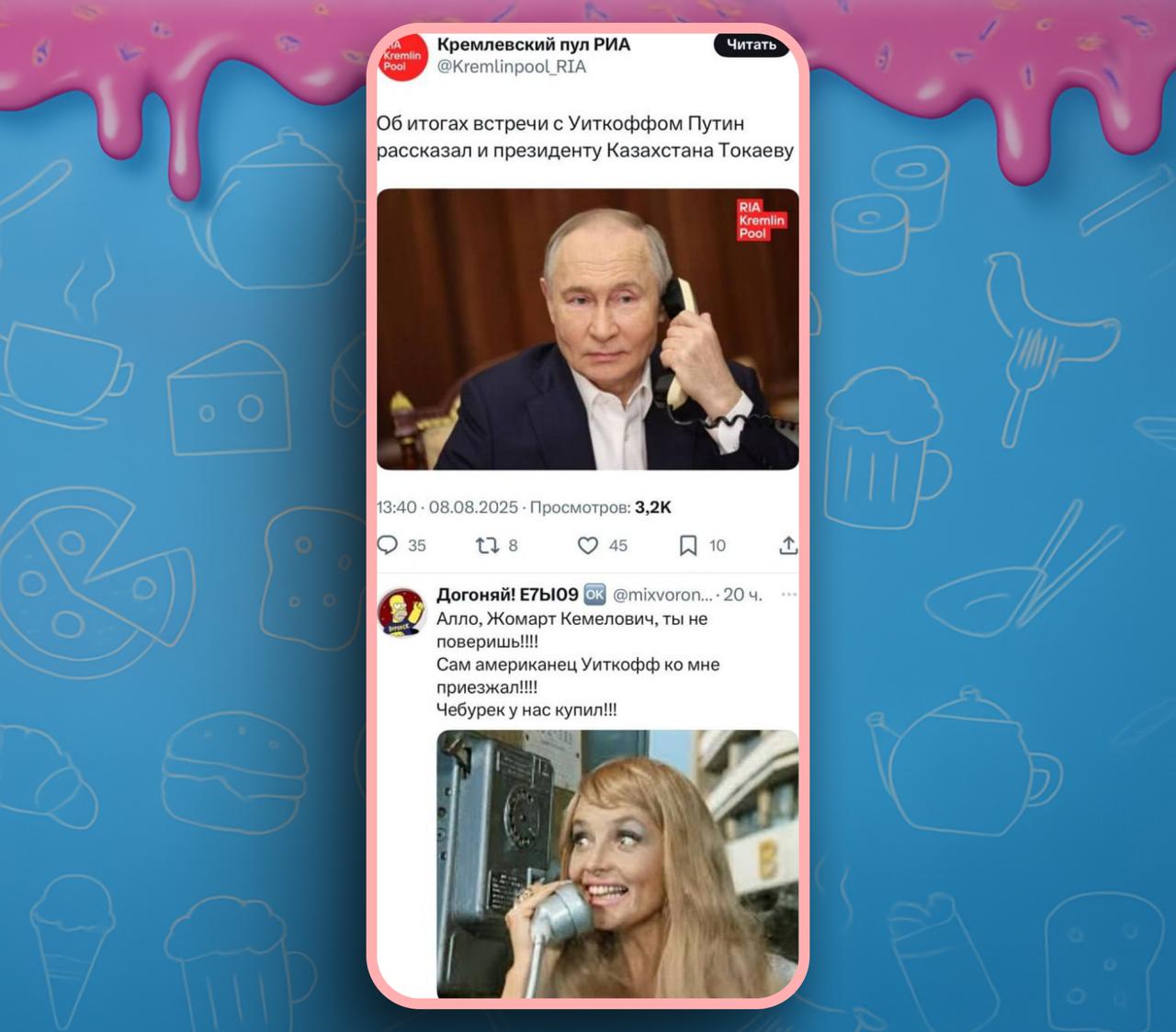 Эта деталь попади в цепкие лапы журналистов, после чего сюжетная линия стремительно завладела интернетом: заграничные публикации традиционно принялись обсуждать, а пользователи соцсетей тут же начали генерировать мемы на тему «переговоров на булочной основе». Создатели чебуреков даже не предполагали, что их съестное превратится в образ недели, а по всей видимости, и глобальный символ примирения. 🩷