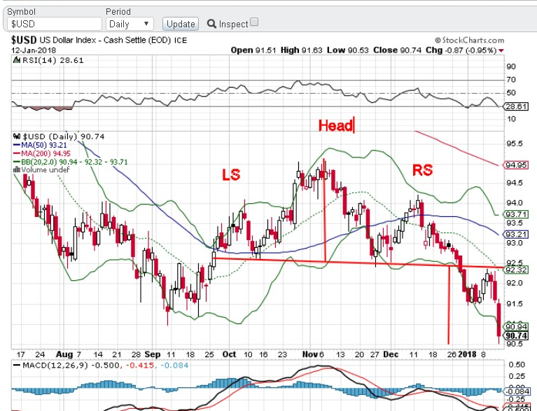 Update on 14-Jan-18: As I expected, the $USD has now fallen to my target at around 90 (see updated chart below) which is also a key support level. If this level does not hold within the next few days, I envisage it going down to about 80 with the price of Gold & Silver rising in opposition. This is a very important time for the USD !