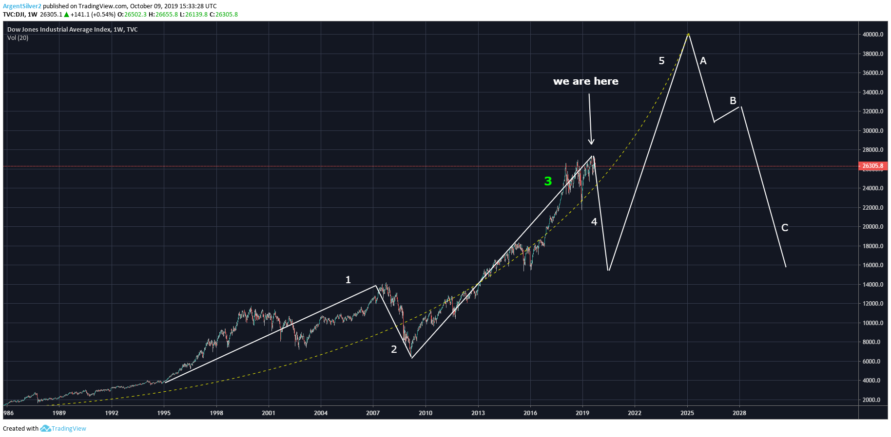 There is of course a possibility that we're only on the 3rd wave of an Elliott Wave cycle, and after the upcoming crash we'll see a final climb to the top before the really big crash happens. My wave 5 is extended a little, so a 40,000 Dow Jones Index is probably unlikely, but it's still possible because of the psychological weight the number 40 and 40,000 may have.