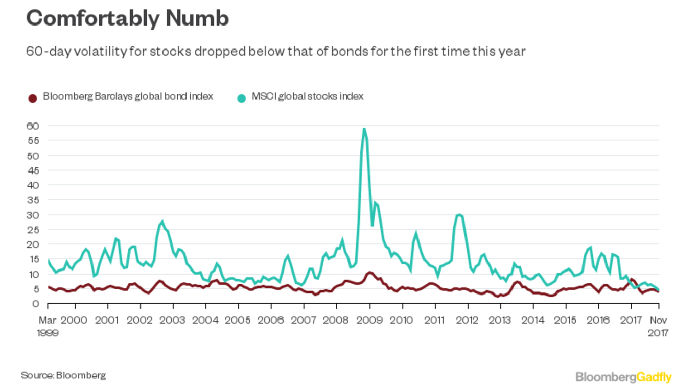 That surge in equity values has been accompanied by a drop in price swings. As our Bloomberg News colleague Wes Goodman pointed out last week, equity market volatility has dropped below that of bonds for the first time ever this year.