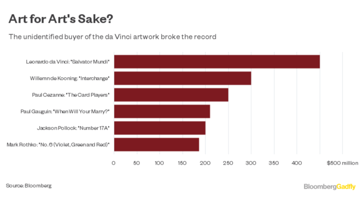 Last month saw the record for the highest price paid for a work of art obliterated by an unidentified buyer who bid $450.3 million for Leonardo da Vinci's "Salvator Mundi" at a Christie's auction -- compared with its pre-sale estimate of $100 million.