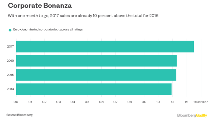 Sales of new corporate debt denominated in euros are also setting records this year.
