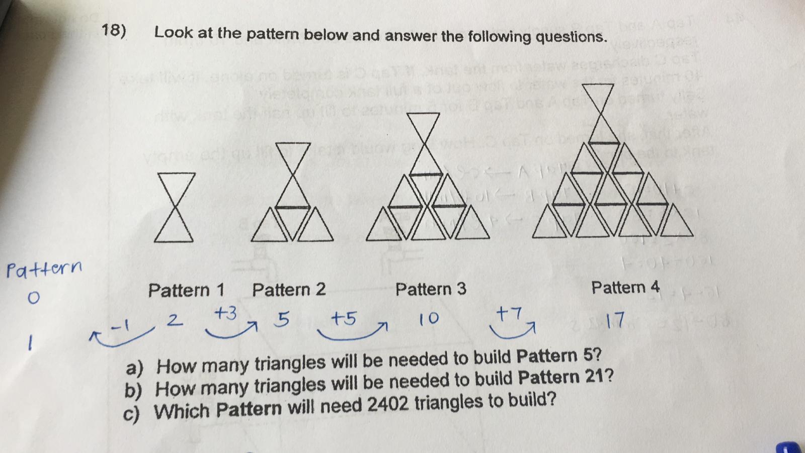 (A) It would take 26 triangles to build Pattern 5 (B) It would take 442 triangles to build Pattern 21 (C) Error