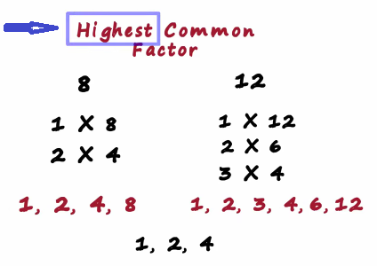 Yes it's commonly referred to as the HCF let's see we want to find the HCF of 8 and 12 to know how the HCF is computed we just need to understand the meaning of the three words highest common factor.