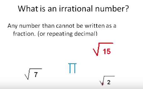 What irrational numbers are are any number that cannot be written as a fraction or repeating decimal