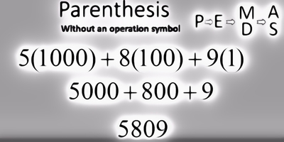 The way I'm saying it should tell you that it is multiplication, but whenever you're given parentheses without a symbol, it means multiplication this is 5,000 plus 800 plus 9 which gives us 5809