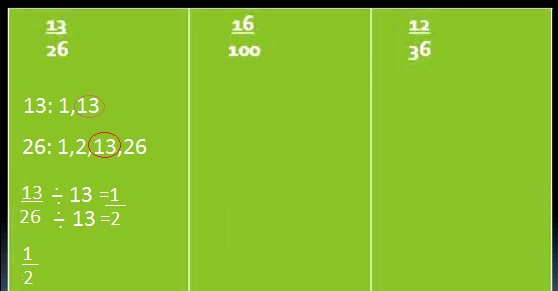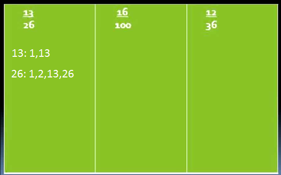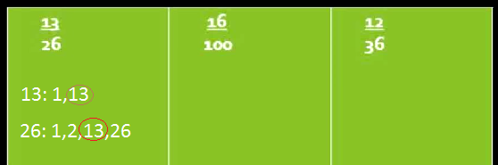 Let's go ahead and do that The fraction of 13 over 26 what we'll do is will look for common factors between 13, 26 to do that what I like to do is look at all the factors of 13 and all the factors of 26.