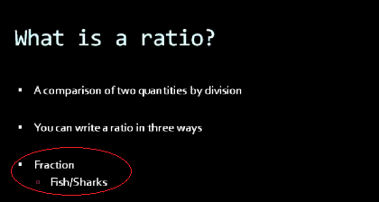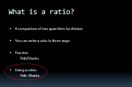 The first way we can write it as the fraction like fish over sharks okay, it's a comparison of two quantities like a number fish in a number sharks its related by division see can write it in a fraction form the numerator divided by the Dominator.