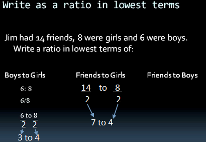 When we do the ratio of friends to Boys it be 14 that the total number of friends and the number of Boys who were his friends as 6 and we can down the lowest terms by dividing each term by 2, 14 divided by 2 is 7, 6 divided by 2 is 3