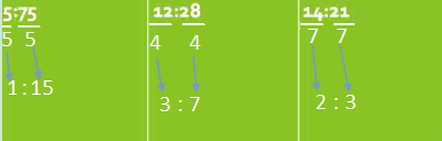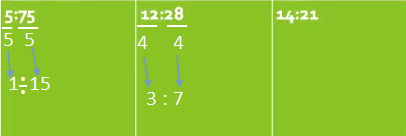 So 5 and 75 are both divisible by five. we could list of the factors if we want we're going to divide each by five we get a ratio of 1 to 15 So 5 divided by 5 is 1. 75 divided by 5 is 15 so we have a ratio of 1 to 15 that is ratio in lowest terms.