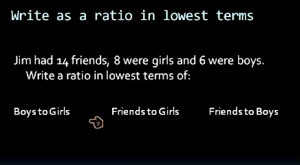 8 were girls 7 were boys write a ratio in lowest terms of the following 3 ratios