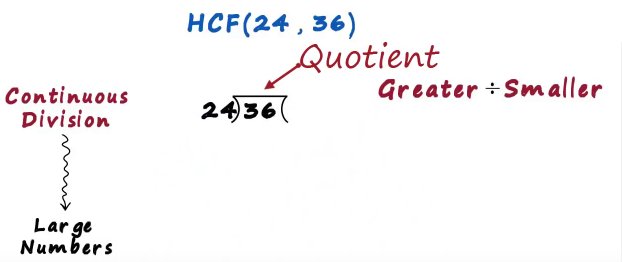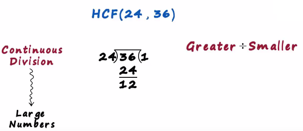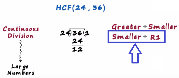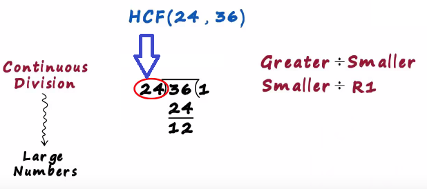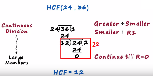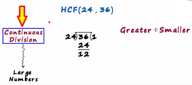 In this post we will understand the continuous division method to find the hcf of two numbers say we want to find the hcf of 24 and 36 this method is generally used for large numbers