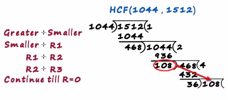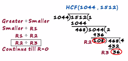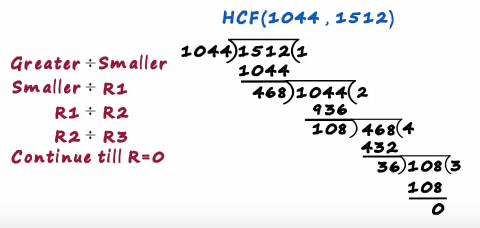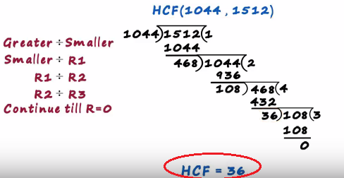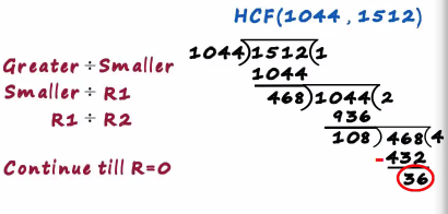 That's where we stopped and the final divisor becomes the hcf hence the hcf of 1044 and 1512 is 36
