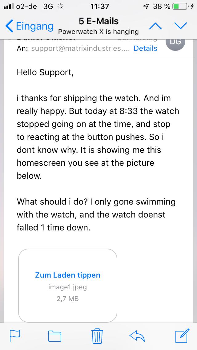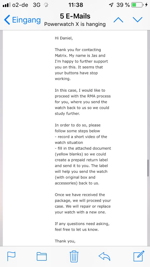Der Support hat noch am selben Abend mit einer .docx Datei im Anhang geantwortet und geschrieben sie würden sich den Fehler gerne anschauen und ich sollte doch bitte die Uhr zur Reparatur zurückschicken.
