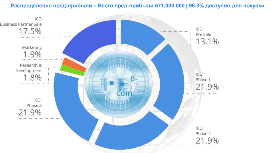 Информация о токенах и их продаже: Имя: MB8; класс: токен утилиты; Сегвит готов; Тип: подтверждение депозита (POS); Алгоритм: Neoscrypt; Основное распространение через ICO; Монеты, доступные через ICO: 550 000 000; Все непроданные монеты будут сожжены, полное предложение в 1 миллиард будет достигнуто в течение 12 лет, первоначальная стоимость составит 1 евро за 5 токенов до момента продажи 75 млн, после цена составит 1 евро за 2 токена. В конце продаж цена токена будет равна 1 евро. Поставка монет увеличивается на 5% в год для достижения этого максимума.