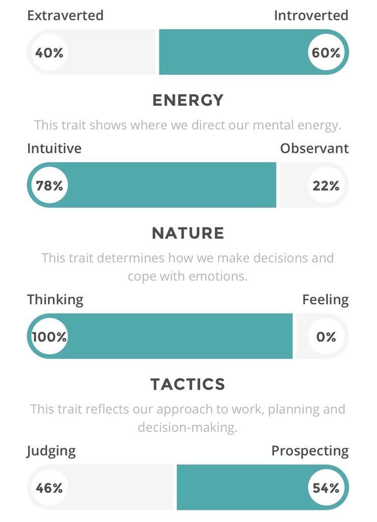 This is so true with me, I hate common. I want to be unique like a freaking snowflake. These results were fairly obvious for me as I have done a lot introspection. Only the percentages were new thing and funny to know.